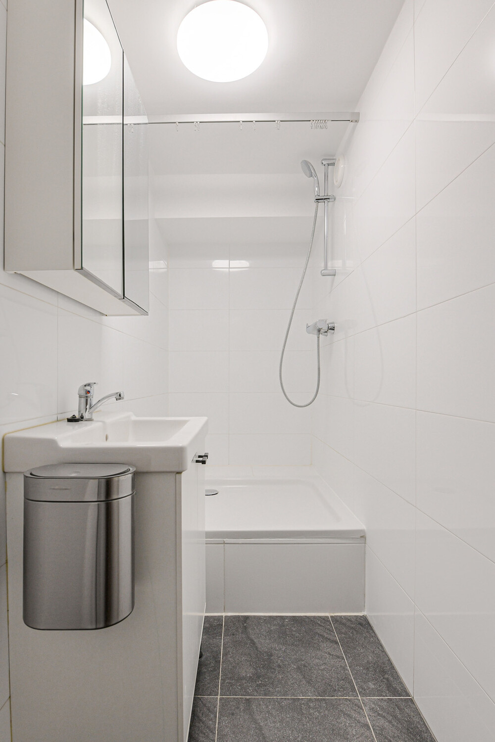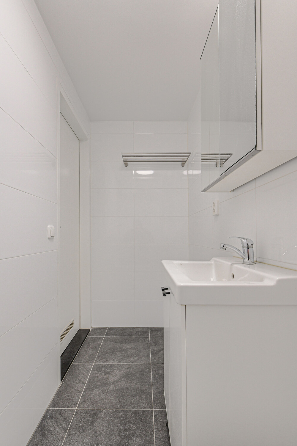 Badkamer (ca. 3,15 x 1,10 m) voorzien van douche met thermostaatkraan en een wastafelmeubel.Berging
