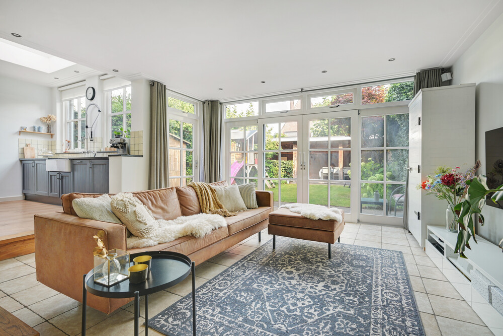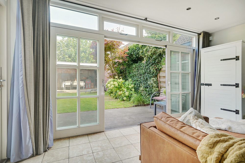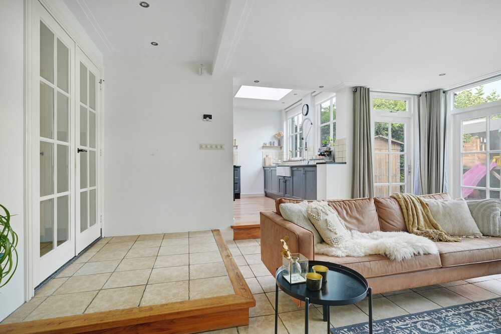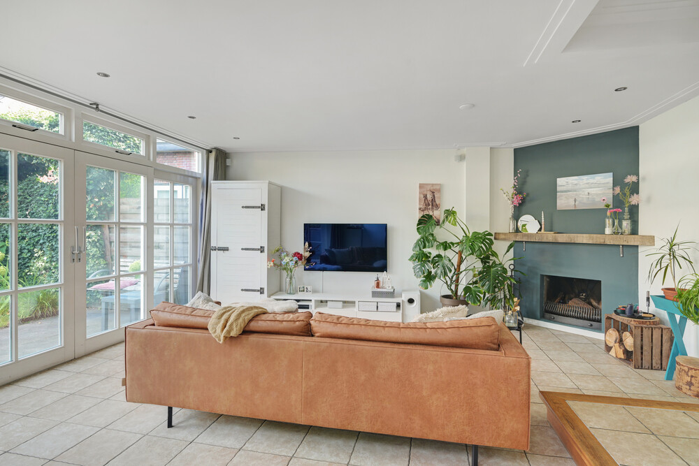 De sfeervolle, ruime en lichte woonkamer is gesitueerd aan de achterzijde van de woning en staat in verbinding met de keuken. De ruimte is voorzien van een tegelvloer met vloerverwarming, een open haard en een plafond met inbouwspots en sierlijsten. Dankzij het niveauverschil heeft de woonkamer een speels karakter. Grote raampartijen aan de tuinzijde zorgen voor veel lichtinval. Een loopdeur en schuifdeuren bieden direct toegang tot de zonnige achtertuin.Woonkeuken