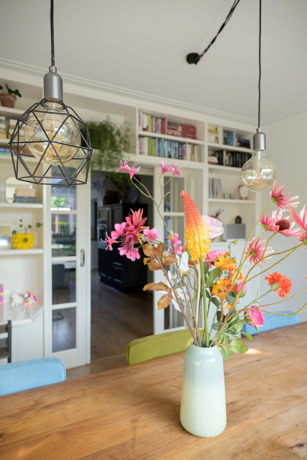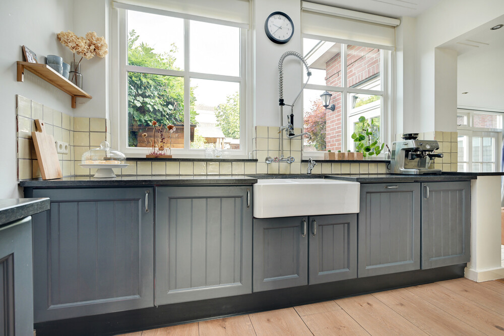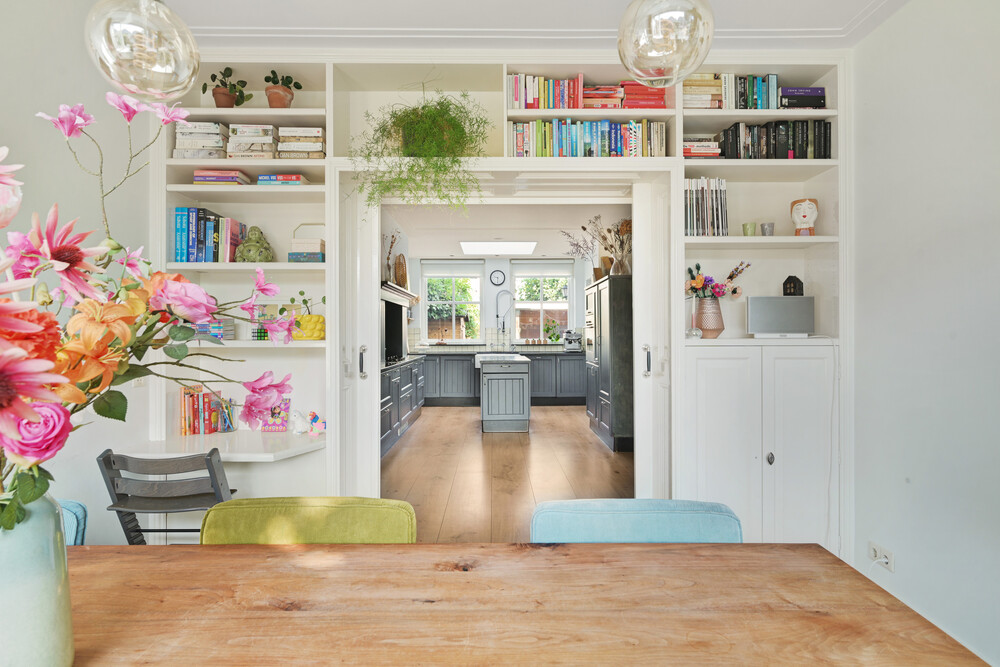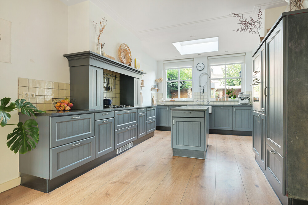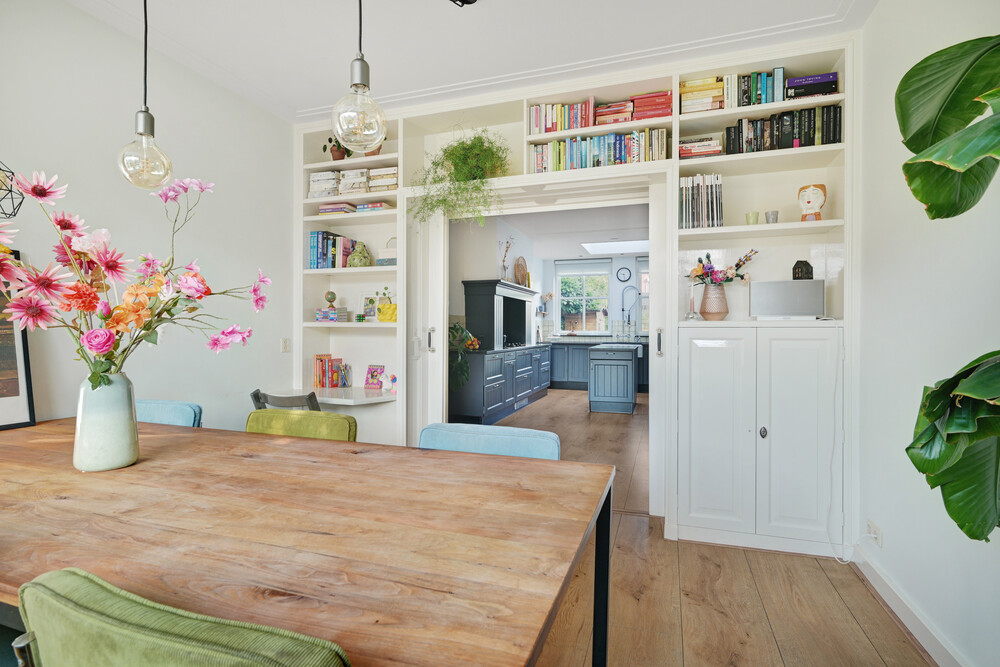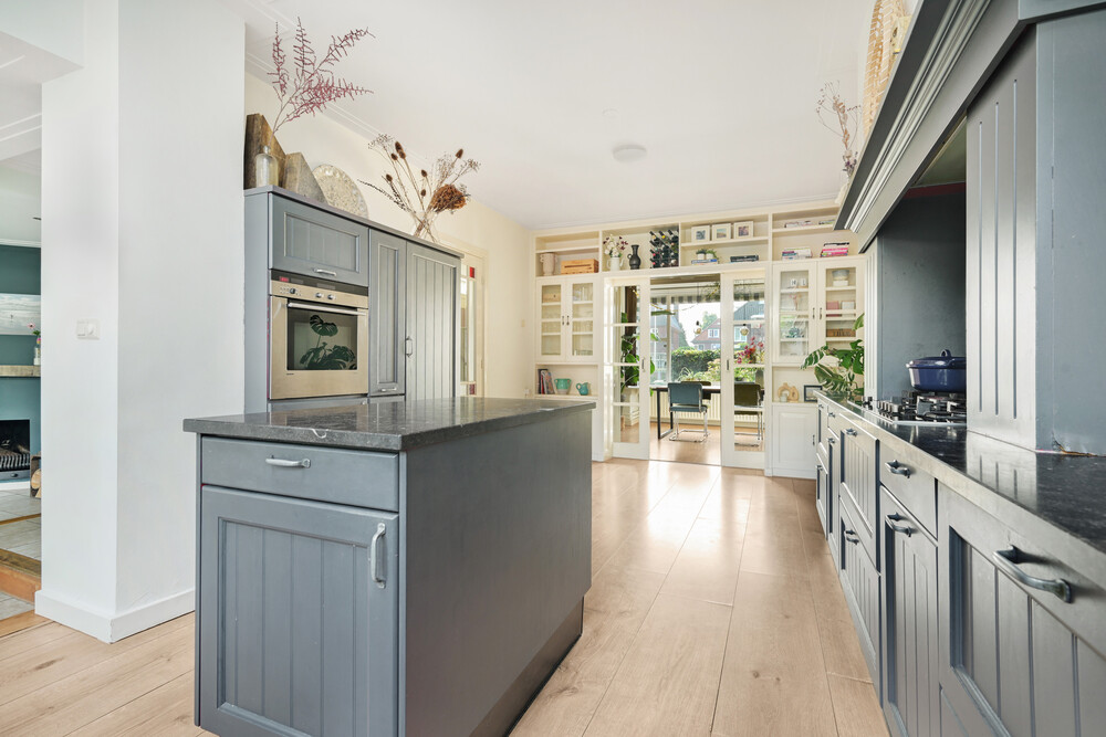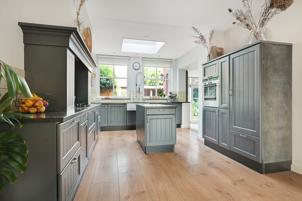 De charmante woonkeuken vormt het hart van de woning. Voorzien van een groot eiland, onderkasten en een hardstenen werkblad is dit een praktische en sfeervolle ruimte.De keuken is voorzien van een 5-pits gaskookplaat, afzuigkap, vaatwasser, koelkast, Quooker en een combi-oven/magnetron. De keuken staat in open verbinding met de woonkamer en via en-suite deuren is de voorkamer bereikbaar.