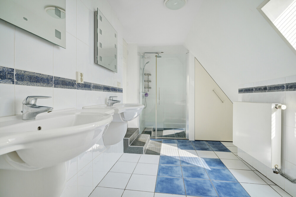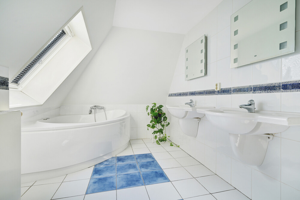 De lichte en ruime badkamer beschikt over een dubbele wastafel, een ligbad, een ruime inloopdouche en een groot dakraam voor extra daglicht.Separaat toilet