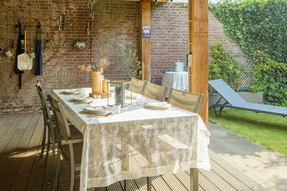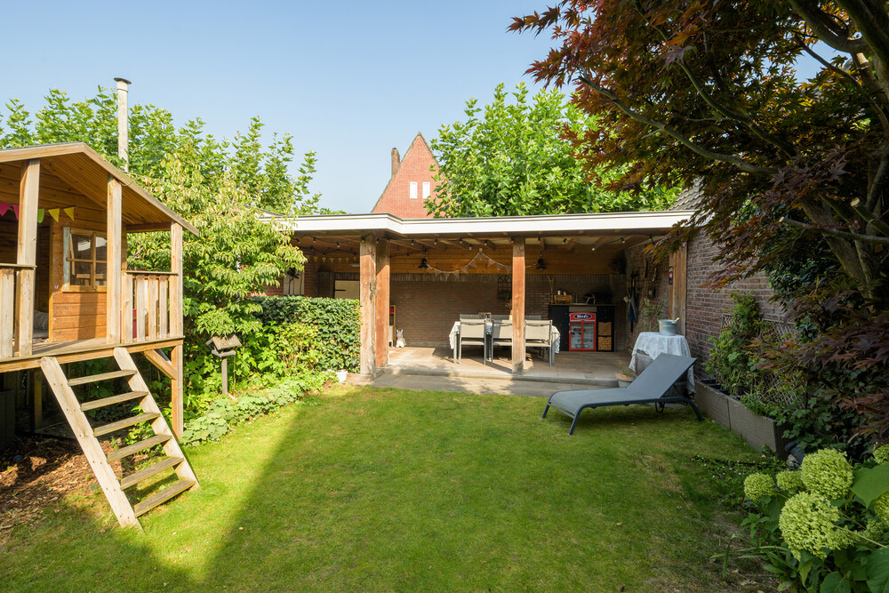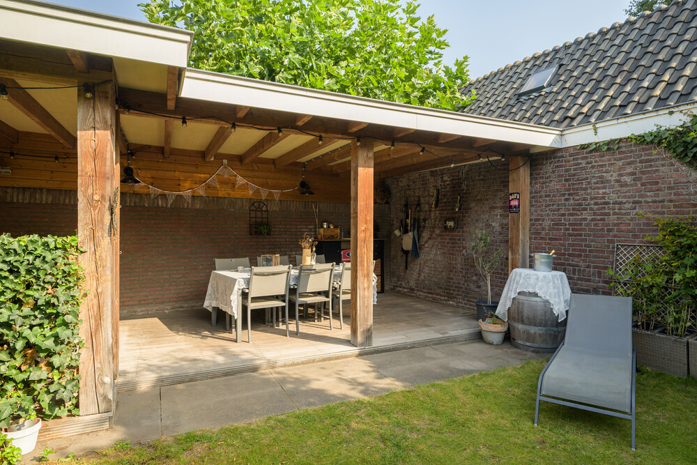 Achterin de tuin staat een royale overkapping over de volle breedte van de tuin, compleet uitgerust met elektra.