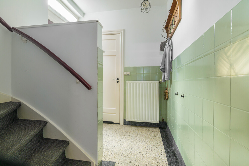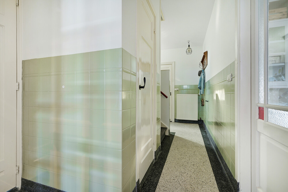 De hal straalt karakter uit met zijn granito vloer en klassieke tegellambrisering. Vanuit deze stijlvolle entree zijn het toilet, de kelderkast, bijkeuken/wasruimte, de royale woonkeuken én via openslaande deuren de woonkamer bereikbaar. Ook de trap naar de eerste verdieping bevindt zich in de hal.Toilet