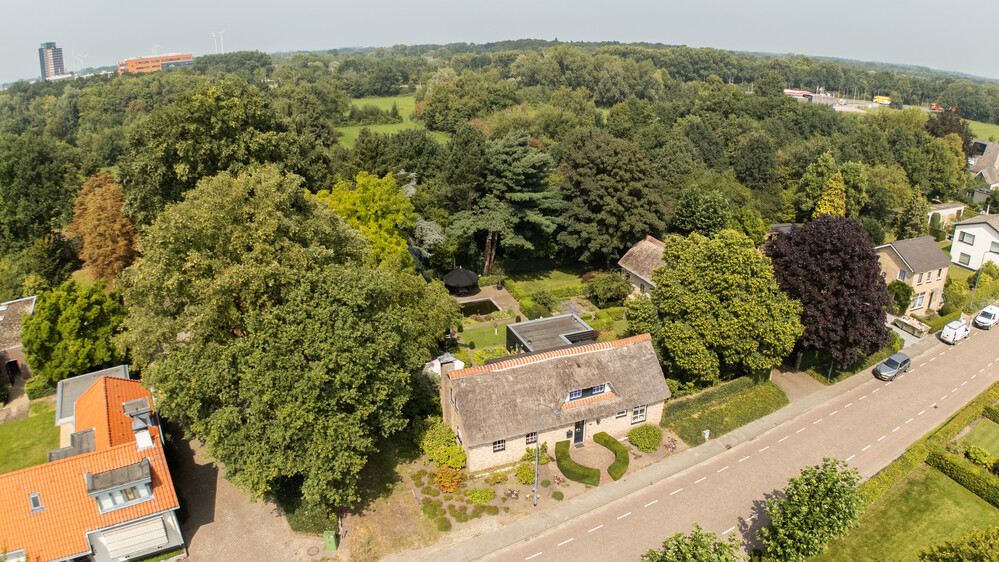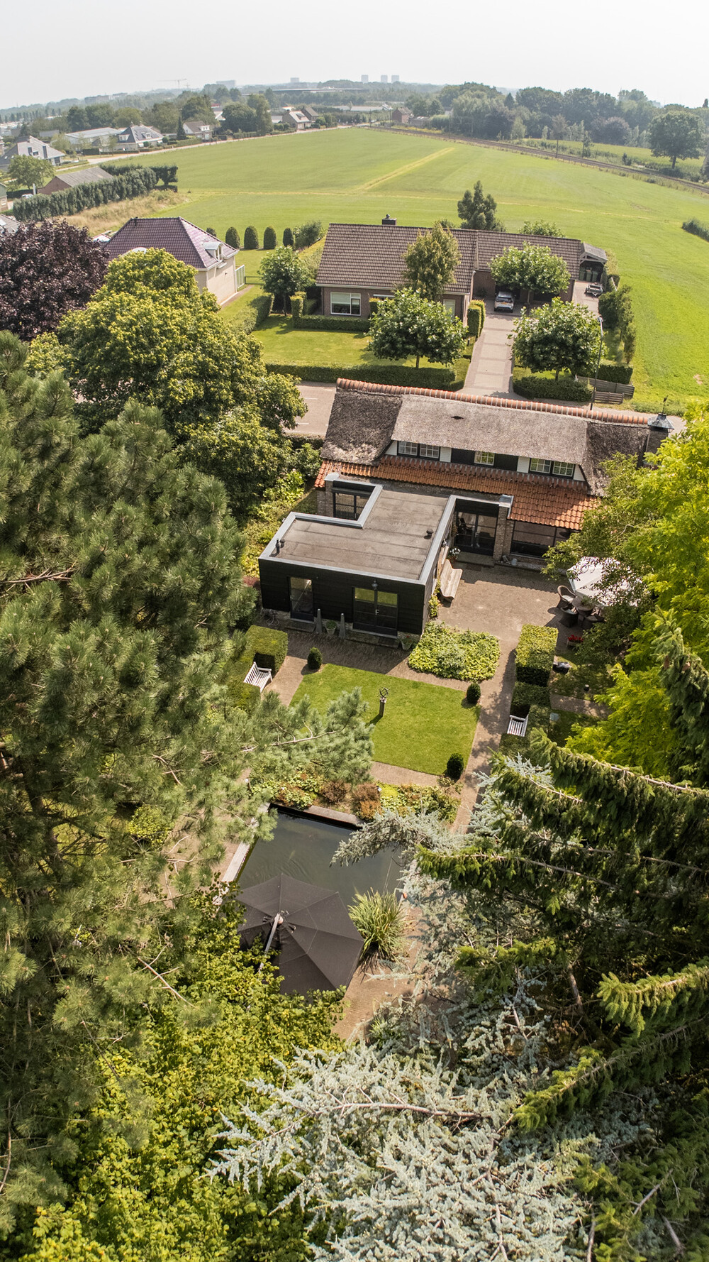 De tuin is prachtig aangelegd, met sierbestrating, allerlei perkjes en borders, diverse gazons en een grote diversiteit aan planten, bomen en heesters (onder andere fruitboompjes en een tamme kastanje). Ook treft u in de tuin een grote vijver met filterinstallatie. Aan de zijkant van het perceel treft u een ruime oprit met een elektrische bedienbaar smeedijzeren hek. Aan deze zijde van de tuin is een zeer ruime garage gesitueerd, voorzien van elektra en water. De garage wordt afgesloten met een elektrisch bedienbare roldeur. Op de verdieping van deze garage treft u een ruime bergzolder. Naast de garage treft u een voorterrein (plaats voor meerdere auto’s), een carport en een afgesloten tweede garage/berging. De garage is in stijl met de woning gebouwd in IJsselsteentjes, deels gepotdekseld en voorzien van een rieten kap.