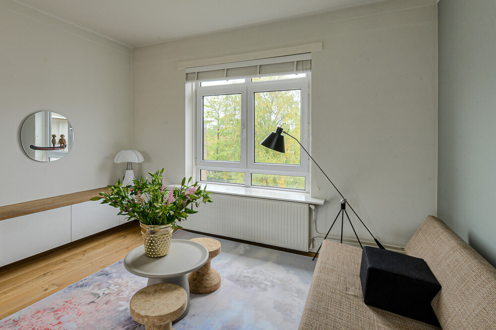 Royale, lichte woonkamer met eikenhouten vloer, sierhaard en openslaande deuren naar het balkon.Balkon i