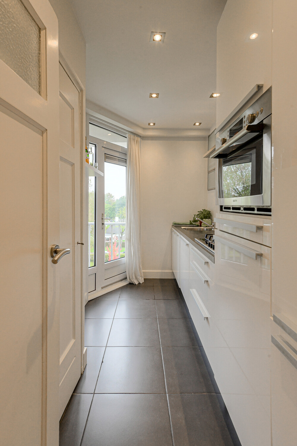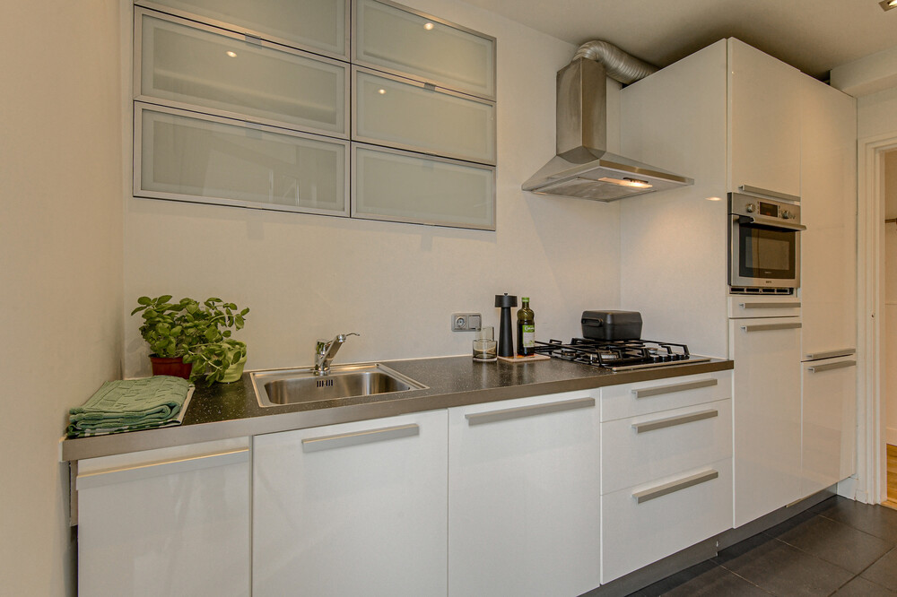 Keuken met tegelvloer en moderne keukeninrichting, voorzien van een werkblad met RVS-spoelbak, 4-pits gaskookplaat, RVS-afzuigkap, combimagnetron, koelkast, 3-laden vriezer, vaatwasser, in de muur weggewerkte bovenkasten, inbouwspots, diverse onder- en bovenkasten/laden en een loopdeur naar balkon II.Balkon ii