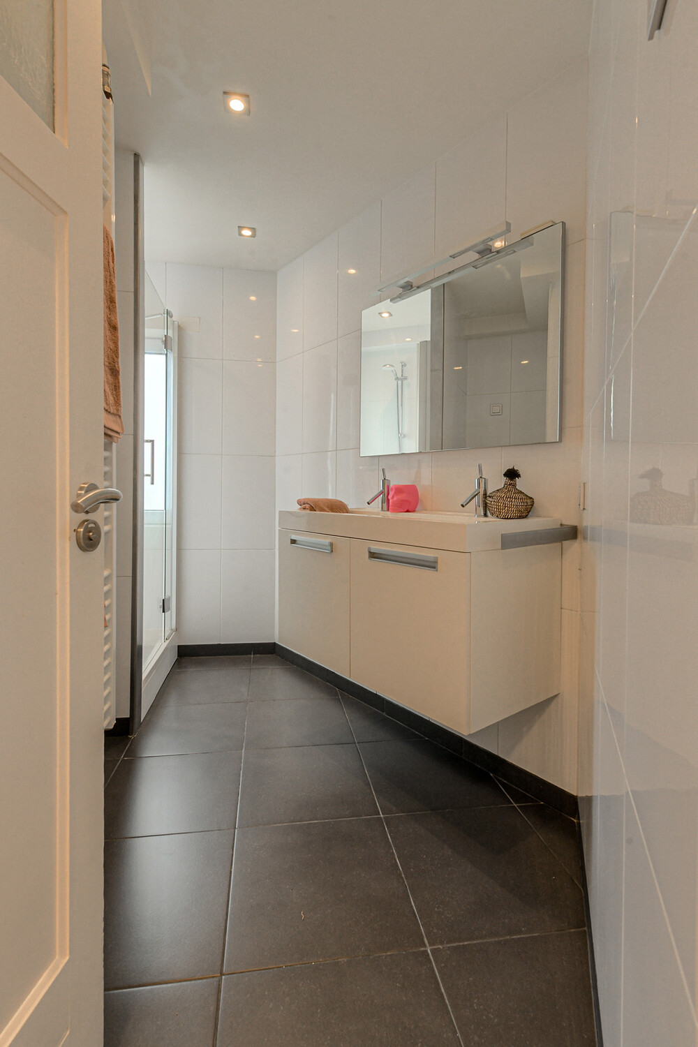 Geheel betegelde badkamer voorzien van een douchecabine met stortdouche en thermostaatkraan, wastafelmeubel met dubbele wastafel, designradiator, inbouwspots en een nis met aansluitpunten voor wasapparatuur.