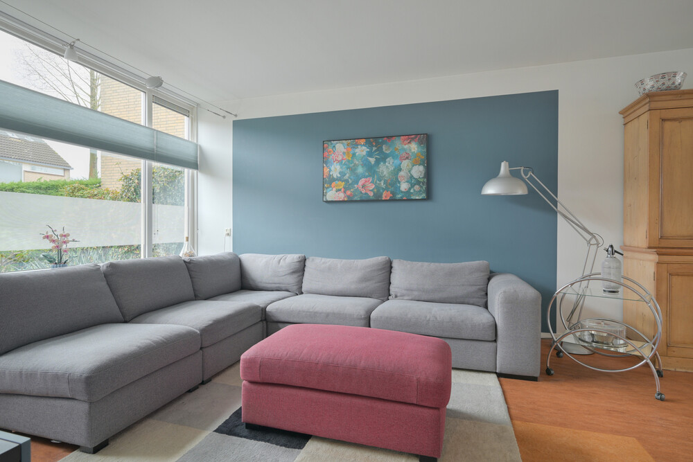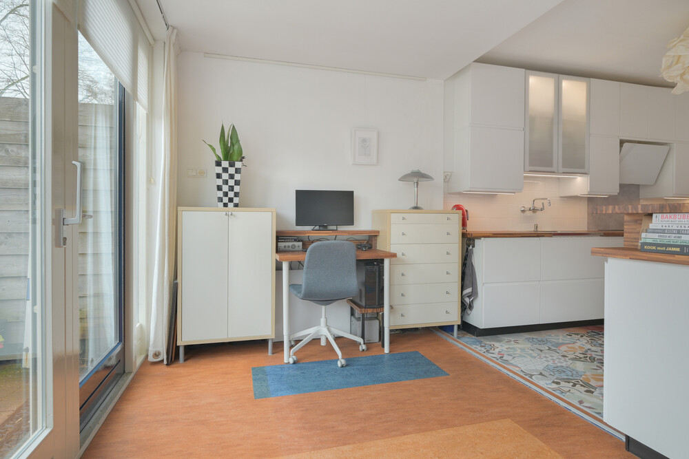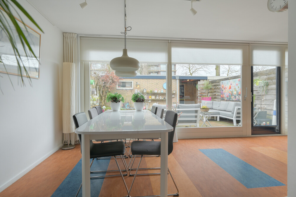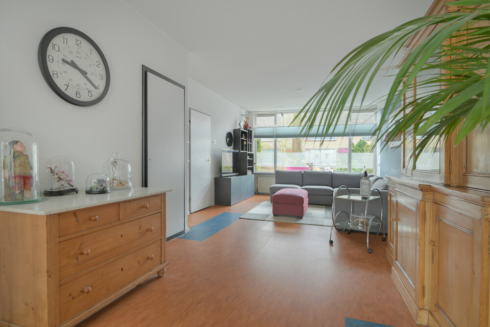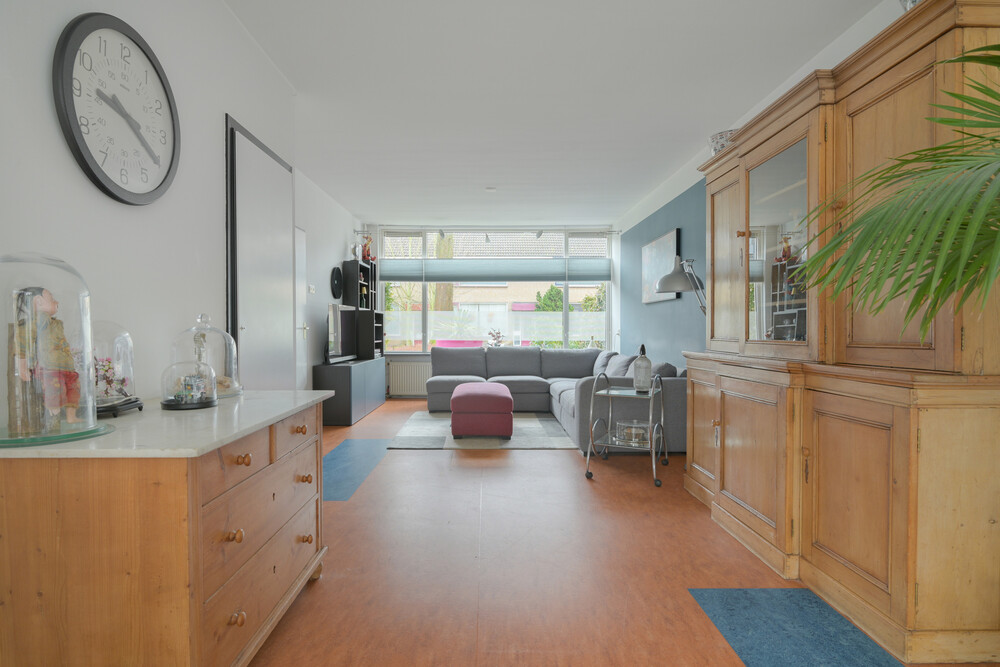 Brede en lichte woonkamer met aan de voor- en achterzijde grote glaspartijen. In de woonkamer tref je een vaste kast.De tuinkamer verbindt de woonkamer en de half open keuken met elkaar. Vanuit deze kamer kan je zowel via de schuifpui als via de loopdeur in de tuin komen.