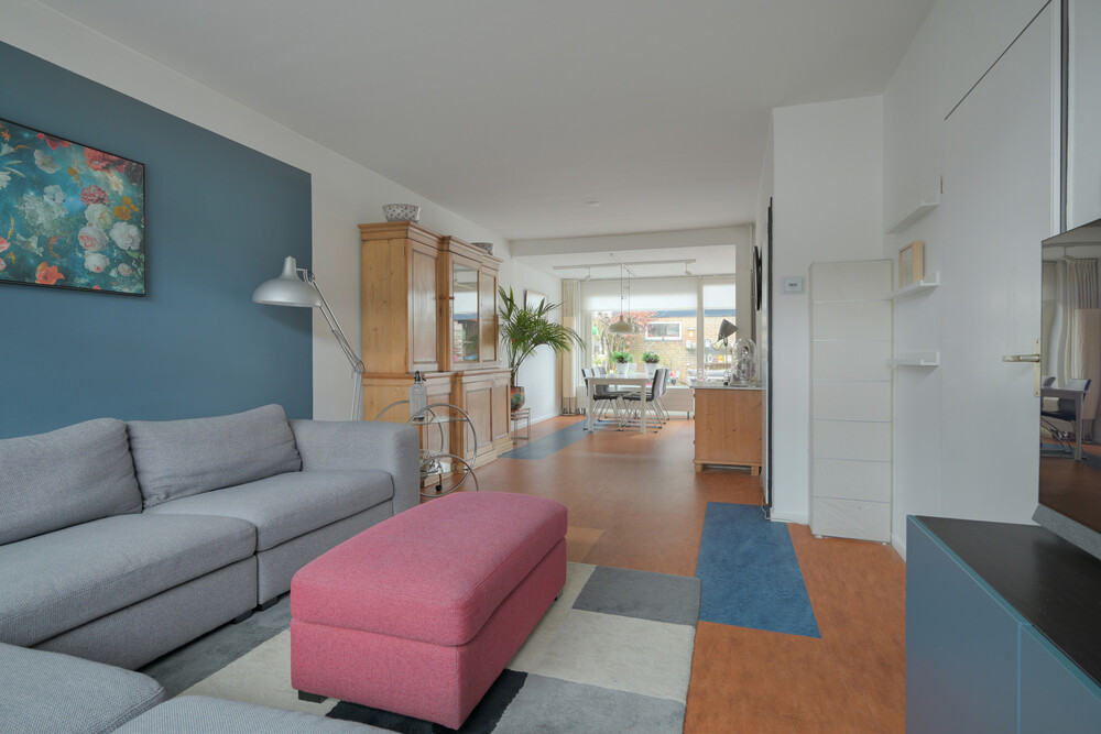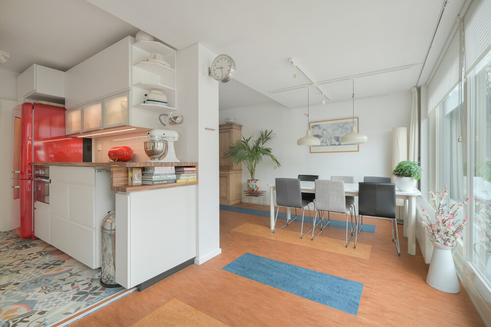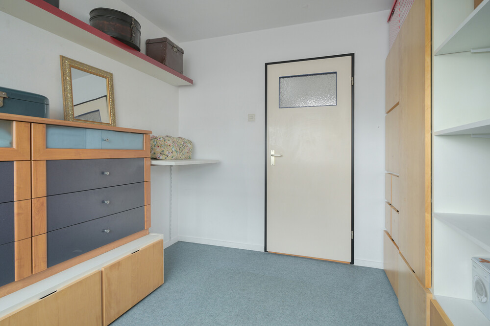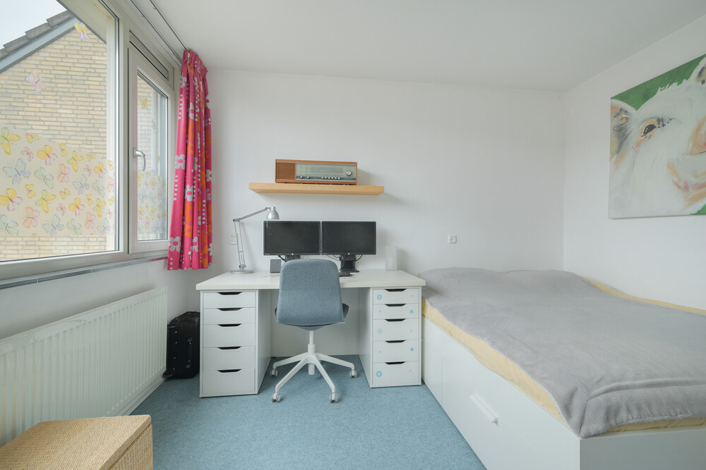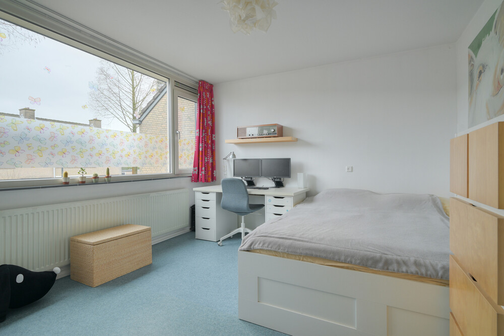 Brede en lichte woonkamer met aan de voor- en achterzijde grote glaspartijen. In de woonkamer tref je een vaste kast.De tuinkamer verbindt de woonkamer en de half open keuken met elkaar. Vanuit deze kamer kan je zowel via de schuifpui als via de loopdeur in de tuin komen.