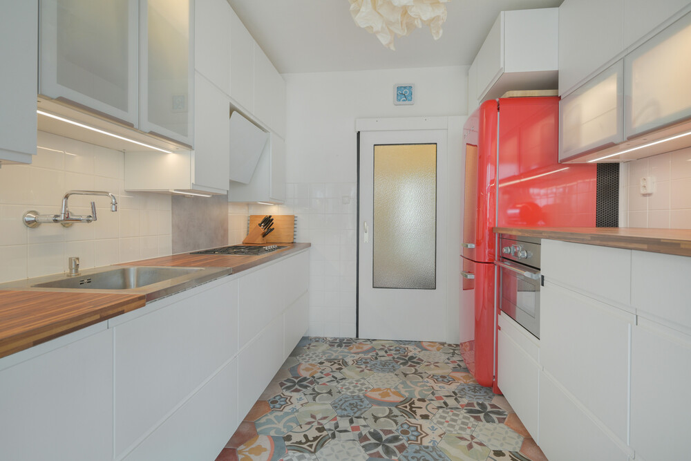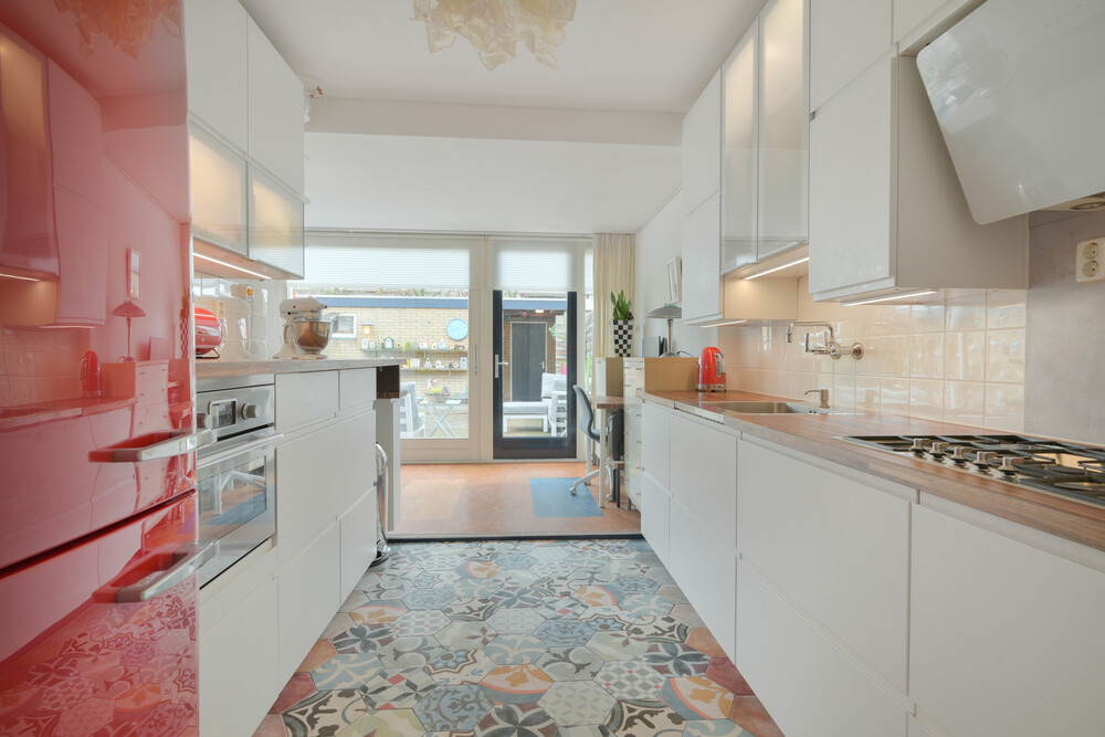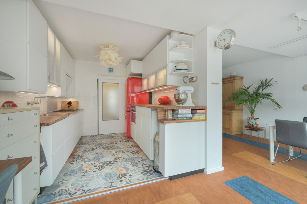 Half open keuken met een moderne inrichting, bestaand uit een houten aanrechtblad met RVS spoelbak, een brede 5-pits gaskookplaat, waarboven een afzuigkap, een vaatwasser en diverse kasten en laden. Wandmeubel met tweede werkblad waaronder – en boven veel kastruimte. Ook is hier een combi-oven geplaatst.De begane grond is, met uitzondering van de keuken, voorzien van een linoleum vloer.