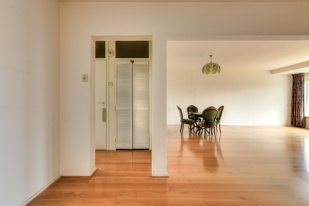 Entree in ruime hal (ca. 2.95 x 4.10 m) met houten lamelparket, garderobenis, video-intercom en een open verbinding naar woonkamer.Woonkamer