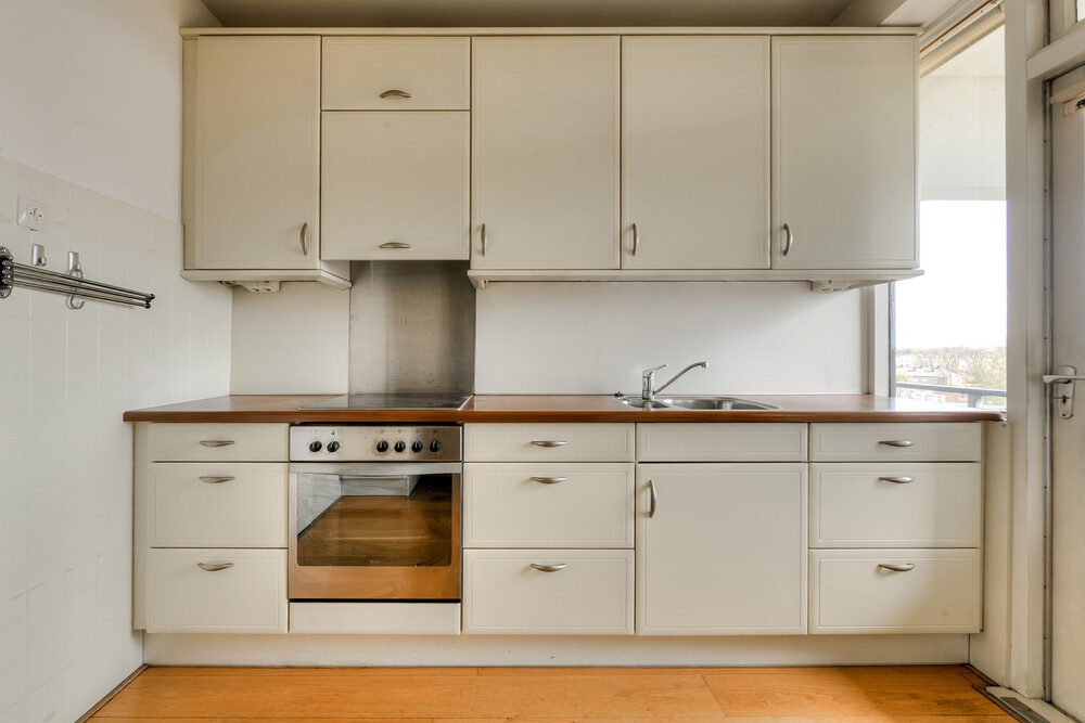 Keuken (ca. 2.90 x 2.95 m) met aanrecht aan beide zijde voorzien van een kunststof blad, 1½- rvs spoelbak, keramische kookplaat, elektrische oven, koelkast en voldoende onder- en bovenkastjes.Vanuit de keuken toegang tot voornoemd balkon.