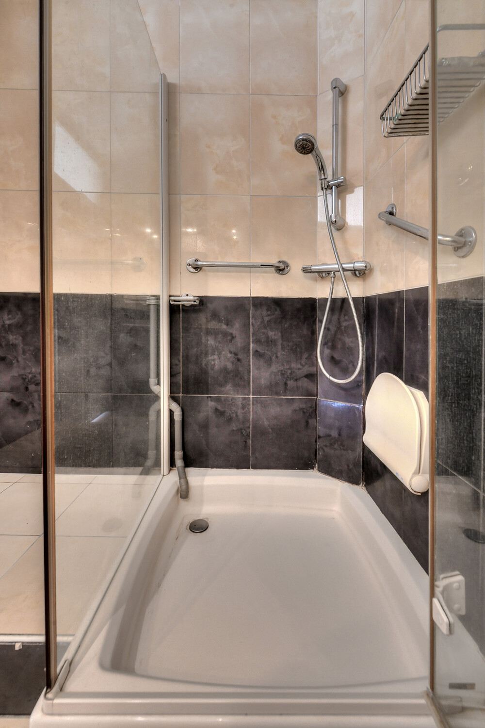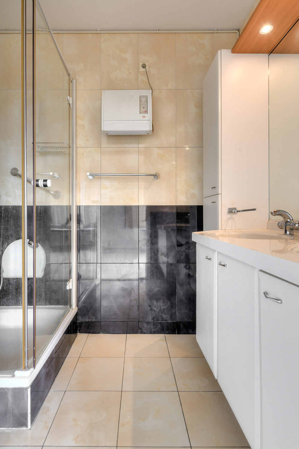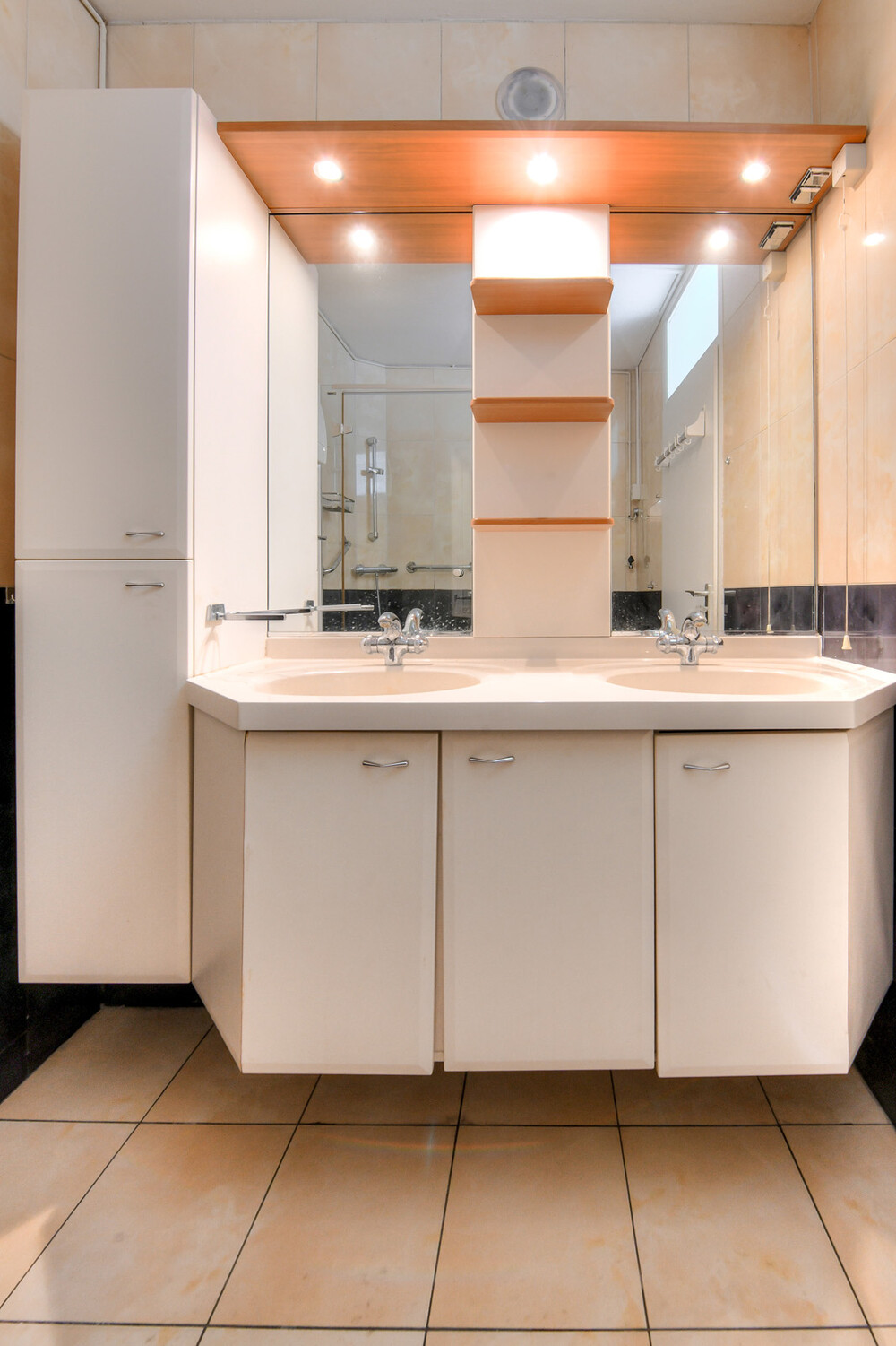 Badkamer (ca 1.85 x 2.25 m) met douche voorzien van thermostaatkraan, badkamermeubel met 2 wastafels, spiegel, kastruimte en de aansluitingen t.b.v. de wasapparatuur.Slaapkamer ii