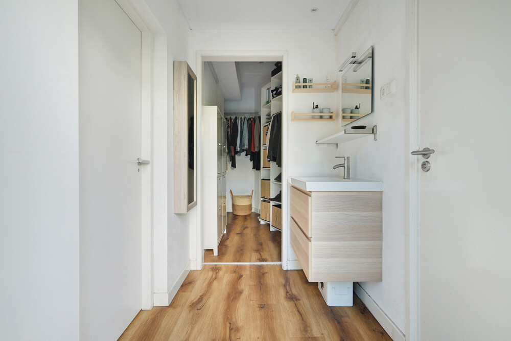 Toilet-/doucheruimte voorzien van een wandcloset met inbouwreservoir en een douchecabine met hand- en regendouche. De ruimte is modern en licht betegeld.Garderobe-/inloopkast