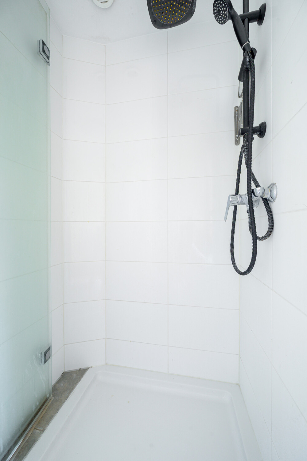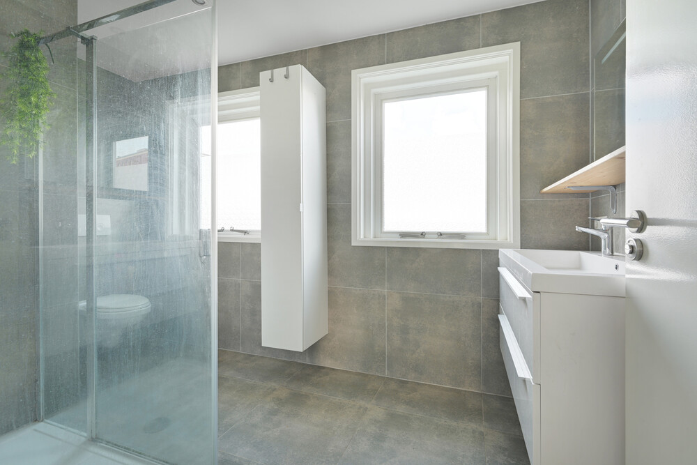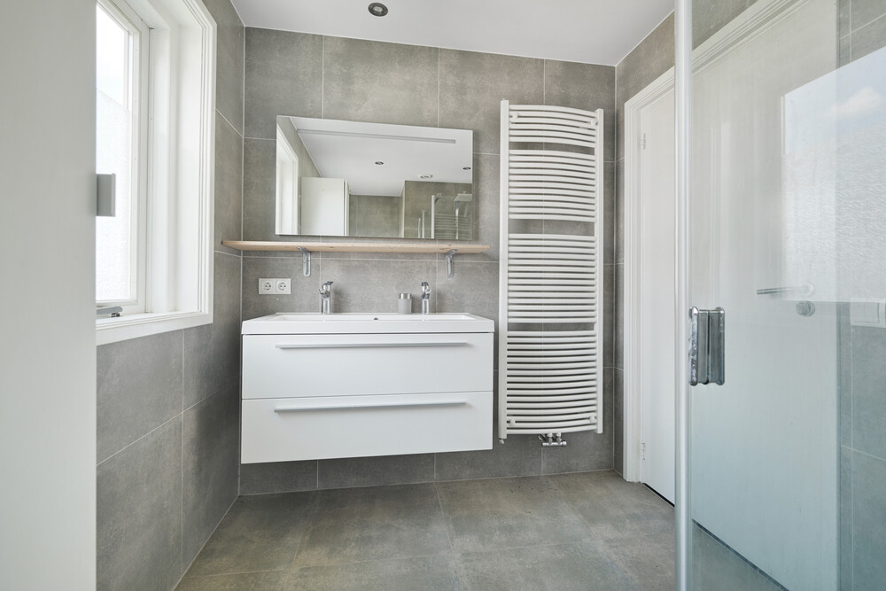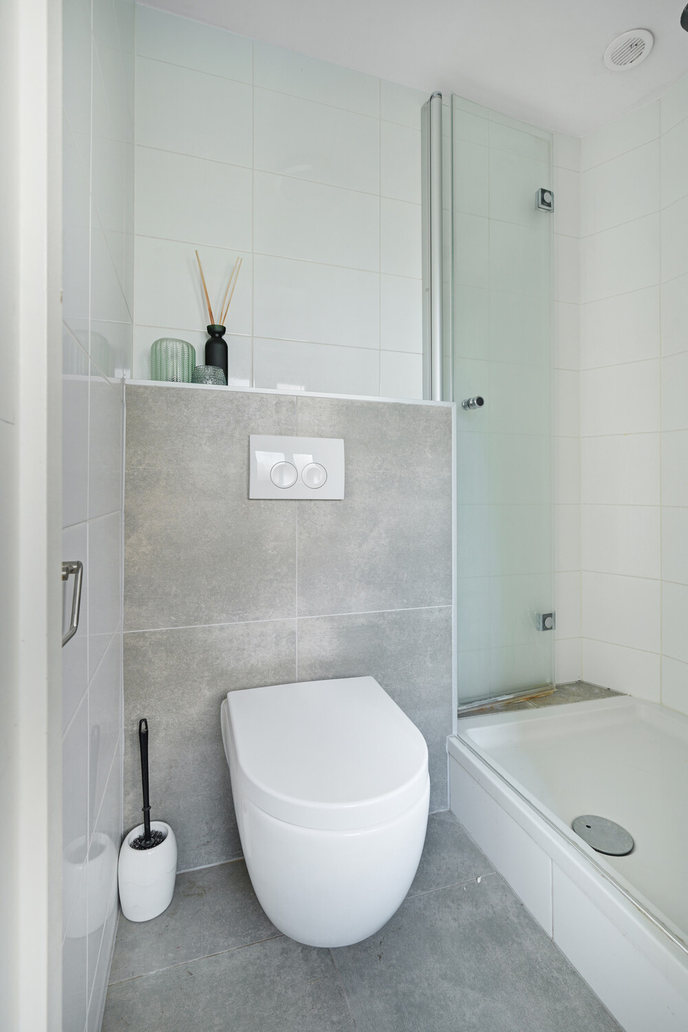 Moderne badkamer met royale douche voorzien van hand- en regendouche, wandcloset met inbouwreservoir en een wastafelmeubel met brede wastafel.Derde verdieping