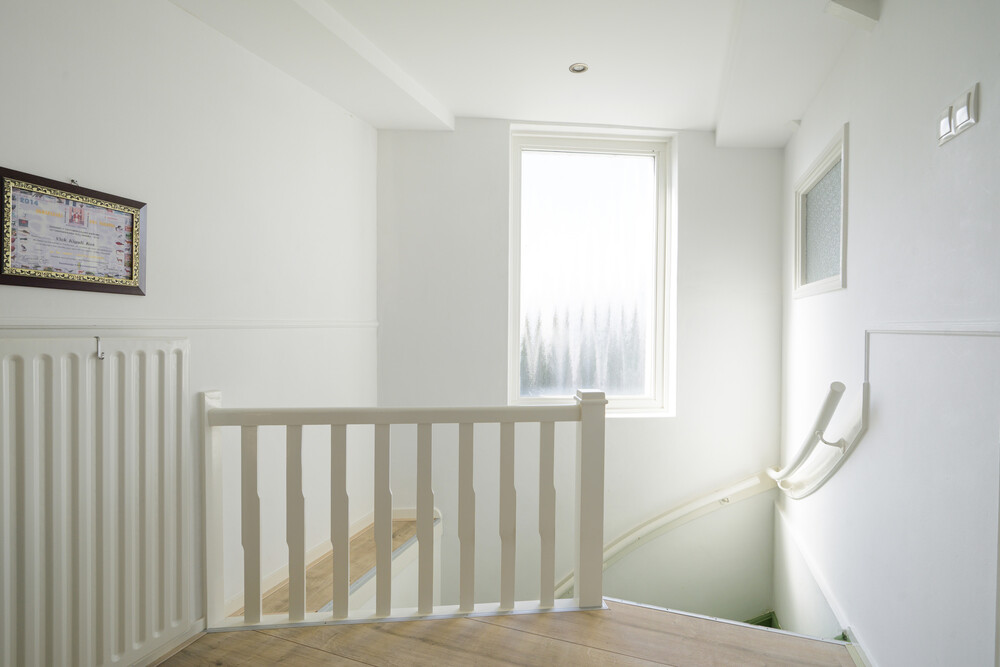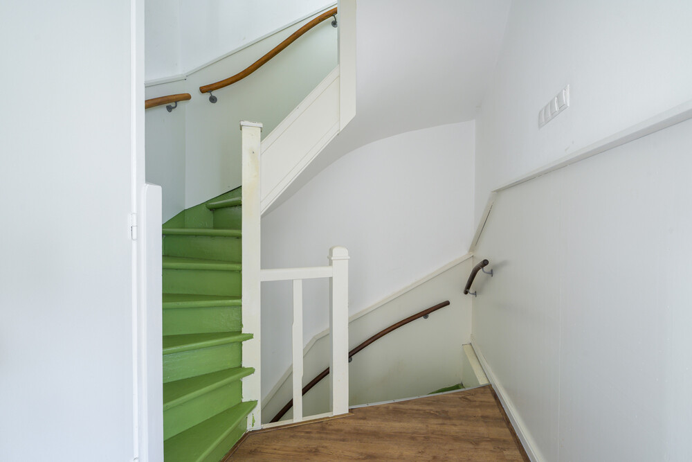 Overloop met trapopgang naar de tweede verdieping en toegang tot de diverse vertrekken.Toilet