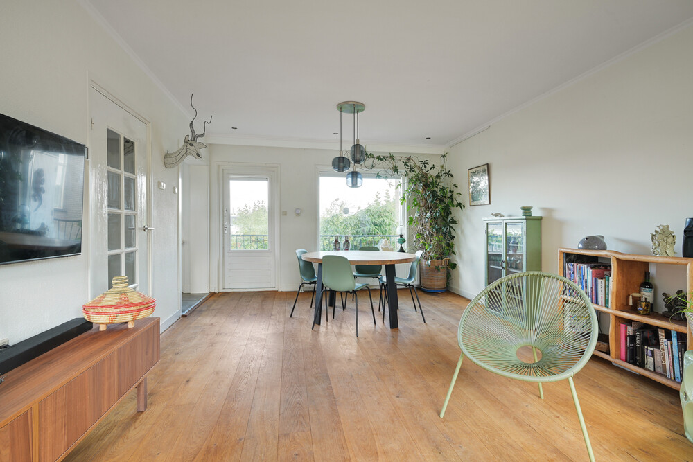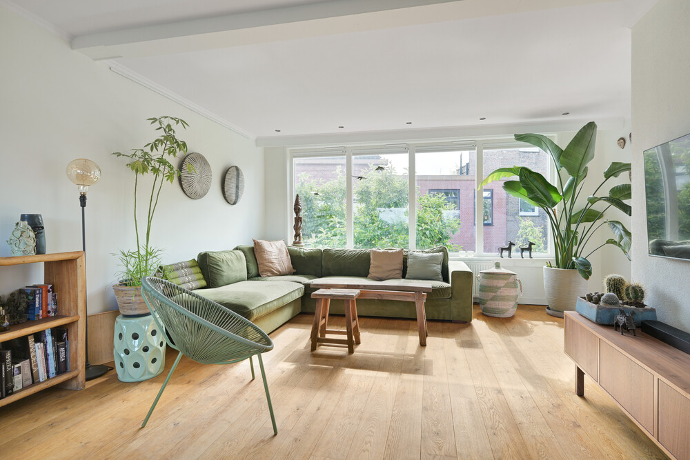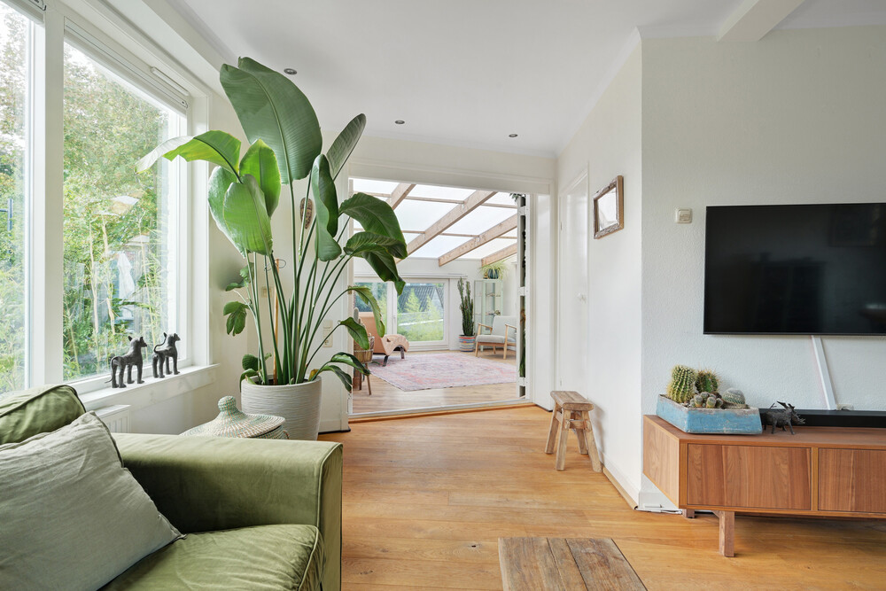 Riante en lichte woonkamer met uitzicht op voor- en achtertuin. De vloer is afgewerkt met elegant parket, het plafond strak gestuct met sierlijsten en voorzien van inbouwspots. Aan de voorzijde bevindt zich een handige inbouwkast.Serre