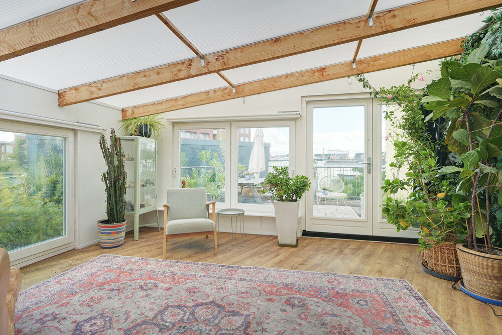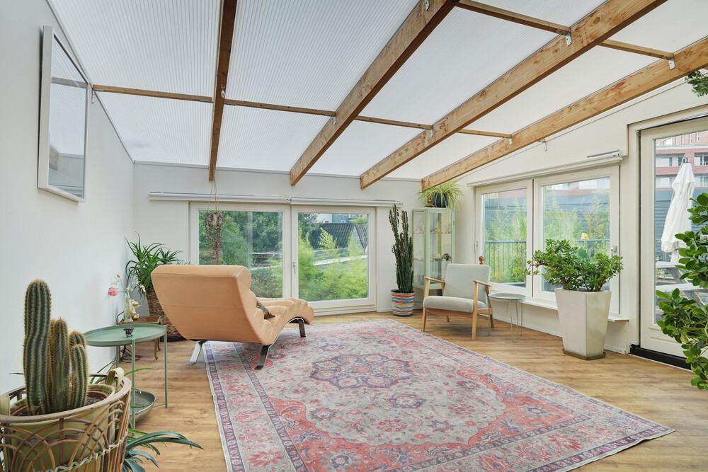 De serre grenst aan de woonkamer en vormt een heerlijk verlengstuk. Deze lichte relaxruimte heeft openslaande deuren naar het ruime terras en biedt een sfeervolle binnen-buitenbeleving.Keuken