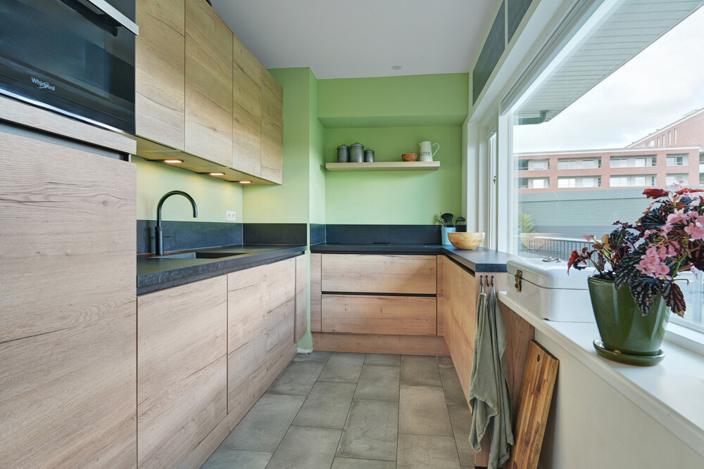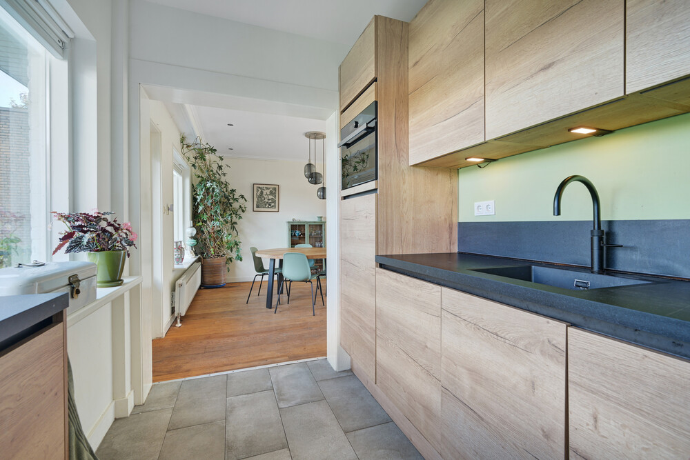 De keuken, gesitueerd aan de achterzijde van de woning, is voorzien van een moderne inrichting met kunststof werkblad, spoelbak, Quooker, koel-/vriescombinatie, combi-oven, inductiekookplaat met geïntegreerde afzuiging en royale kastruimte. Een loopdeur leidt naar het terras en via een trap is de achtertuin bereikbaar.Tweede verdieping
