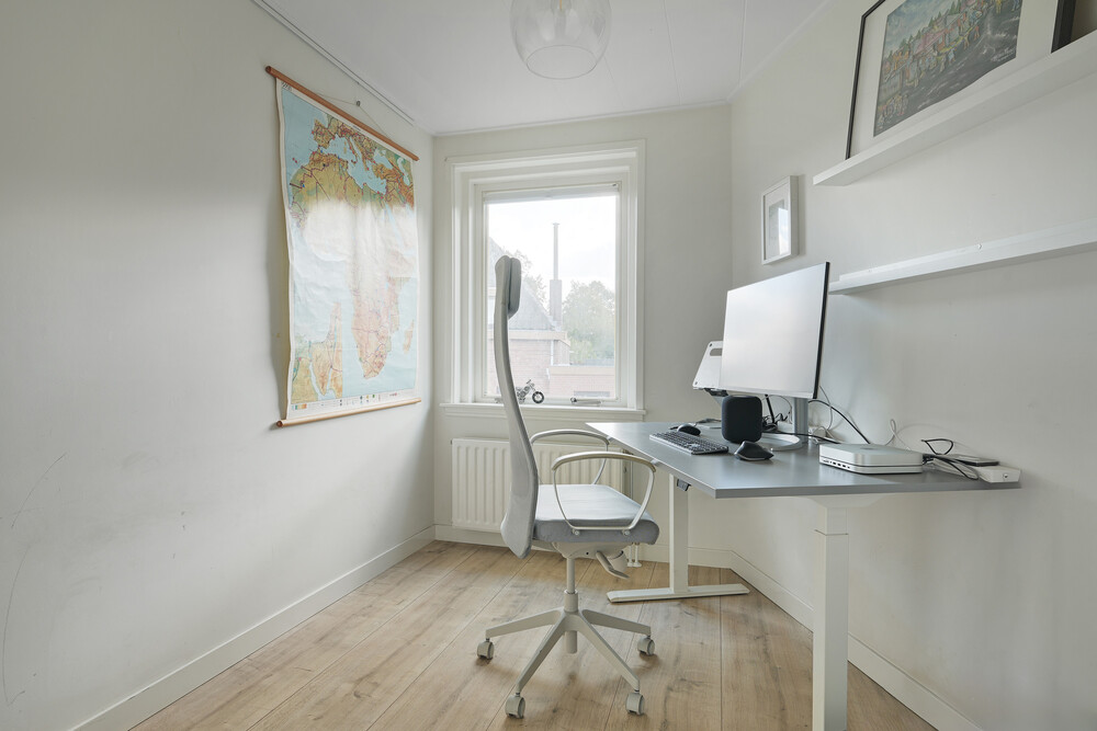 Aan de voorzijde van de woning bevindt zich een royale zit-/werkkamer, die zich onderscheidt door een prachtige lichtinval en een uitnodigende, open sfeer. Een ideale plek om te ontspannen of productief thuis te werken.Achterkamer/slaapkamer