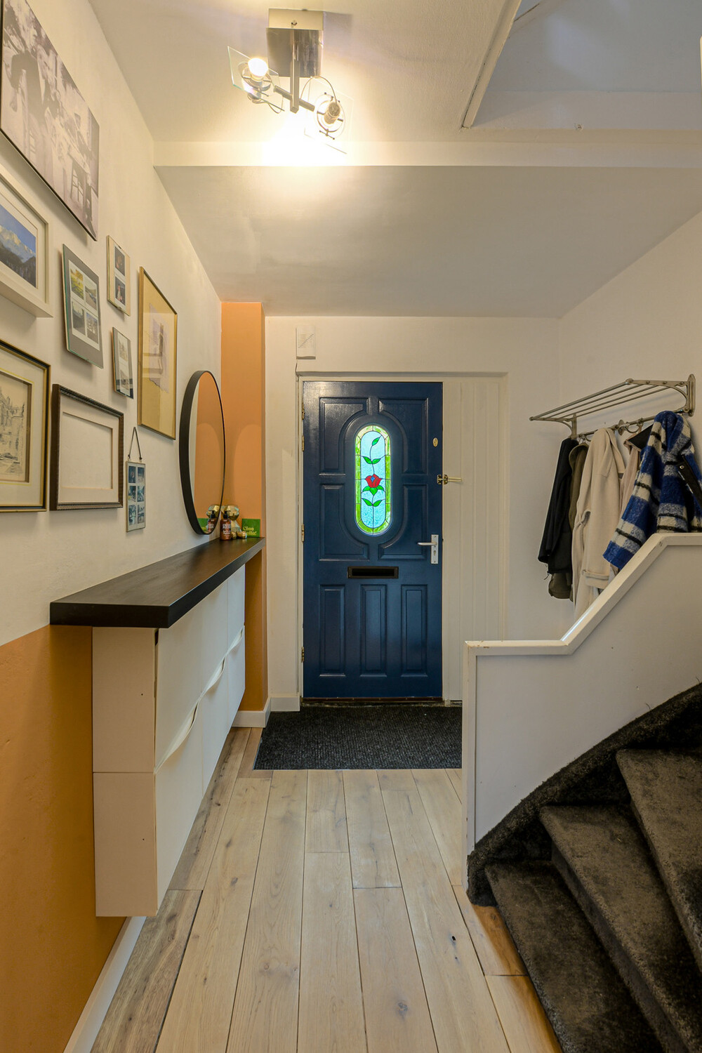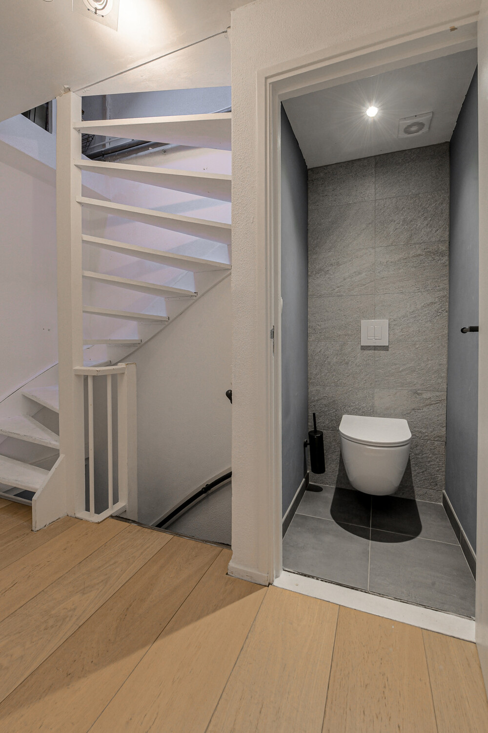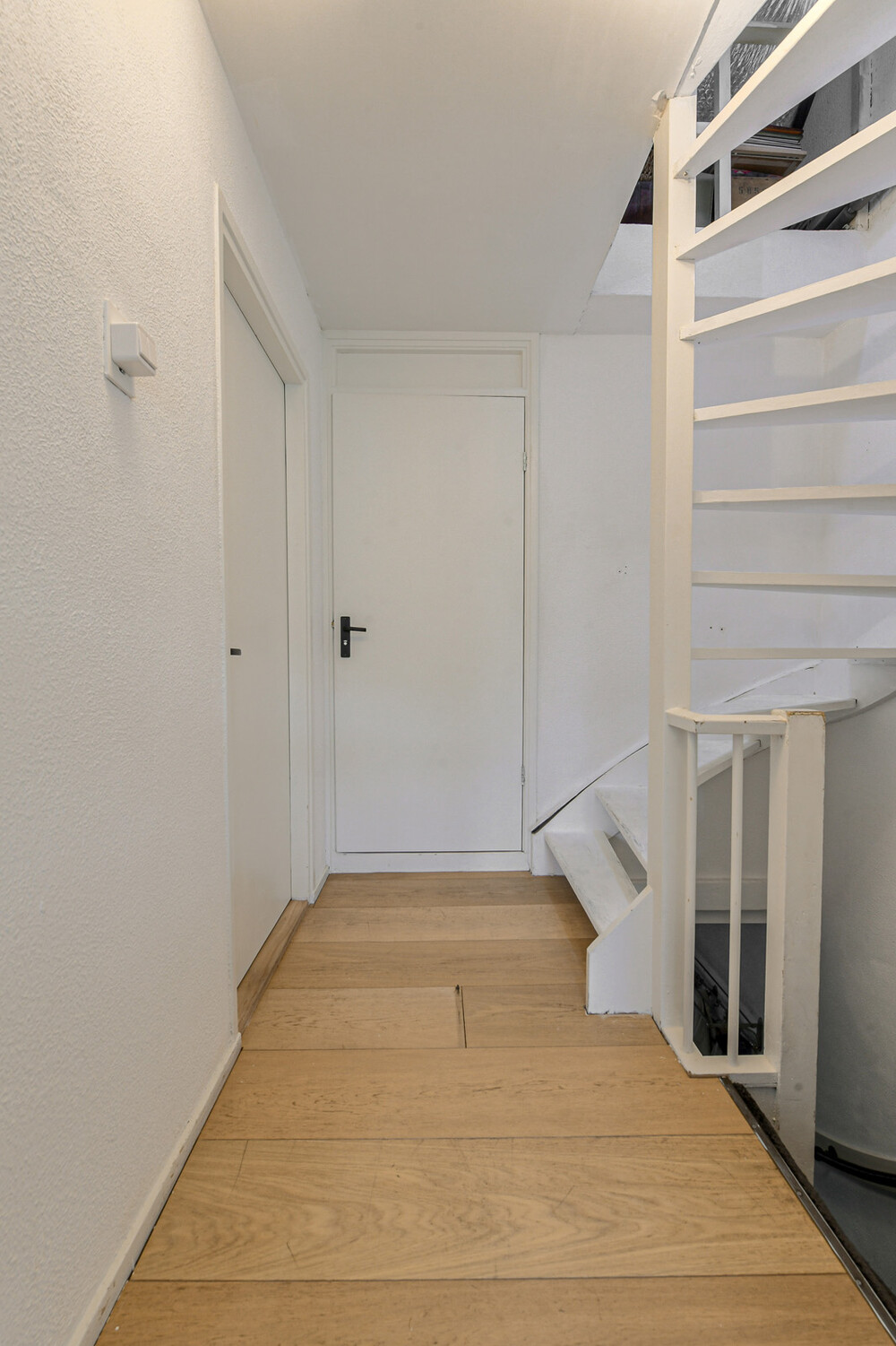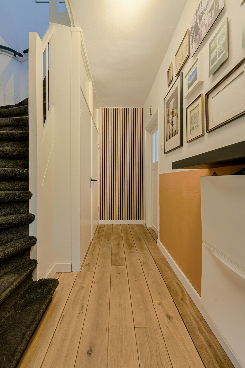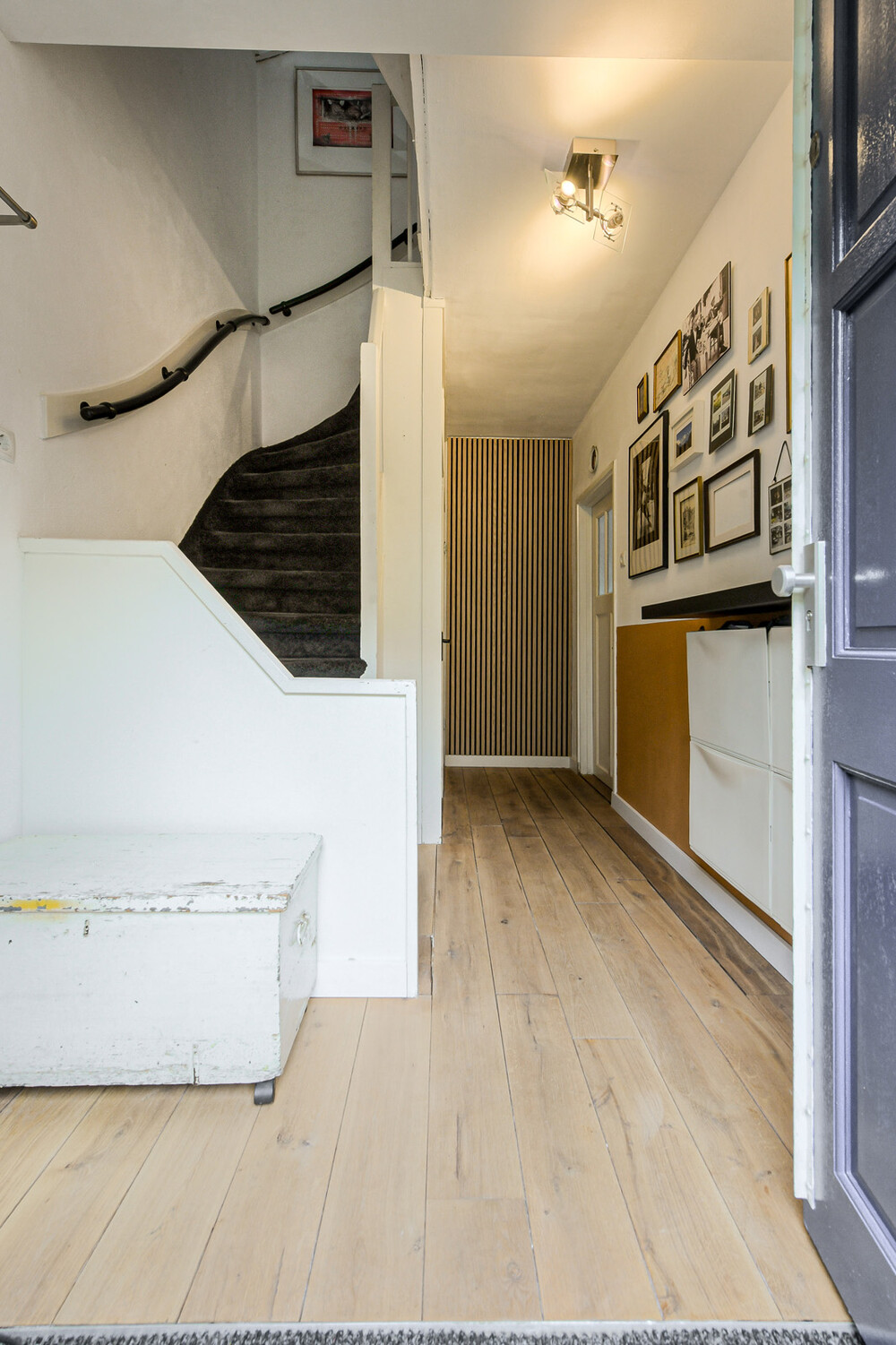 Entree in hal/gang met een eikenhouten vloer, trapopgang naar de eerste verdieping en een verdiepte trapkast met de meterkast (voorzien van 12 groepen en 3 aardlekschakelaars en PV-groep).Toilet