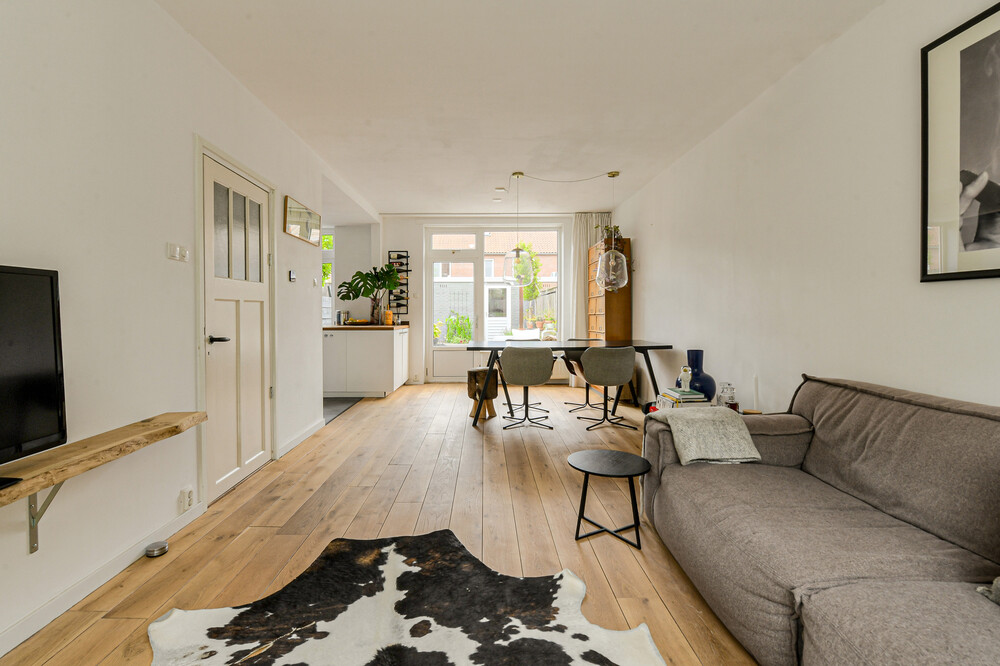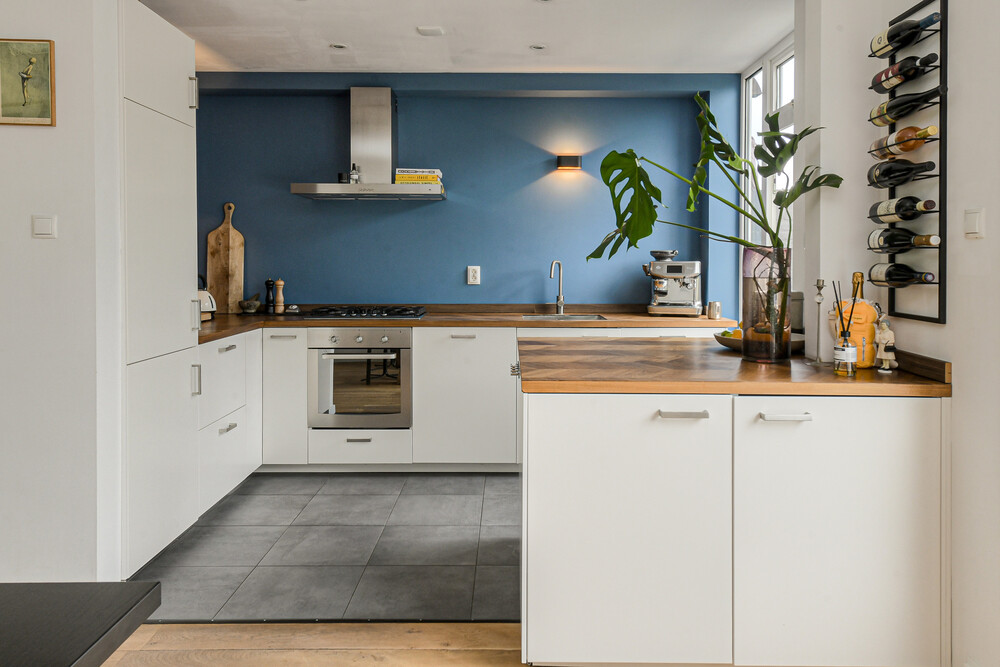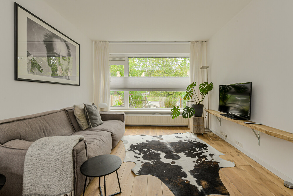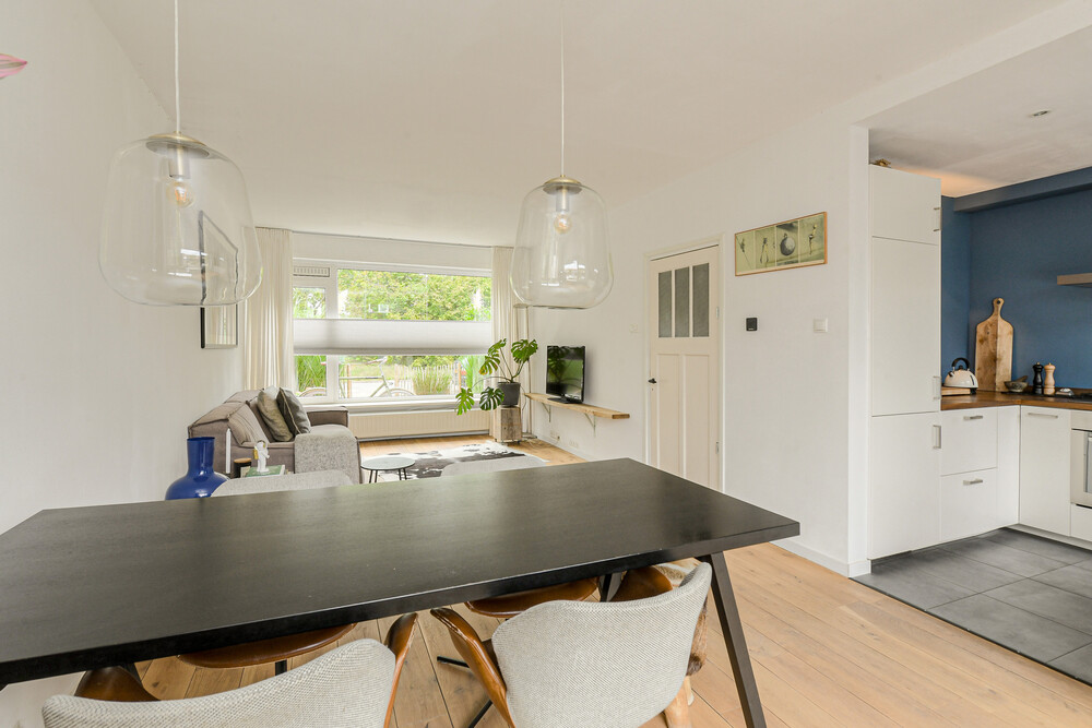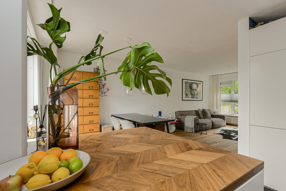 De ruime en lichte woonkamer (ca. 345 x 7.80 m) is afgewerkt met een eikenhouten vloer en beschikt over een stapdeur naar de achtertuin. Vanuit de woonkamer is er een open verbinding naar de keuken.Keuken