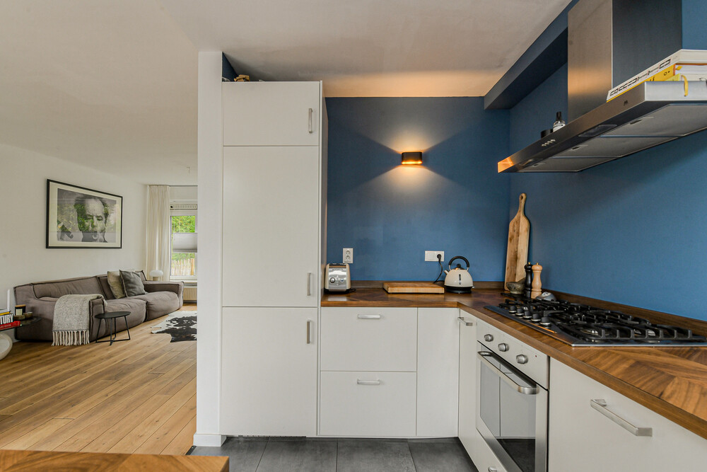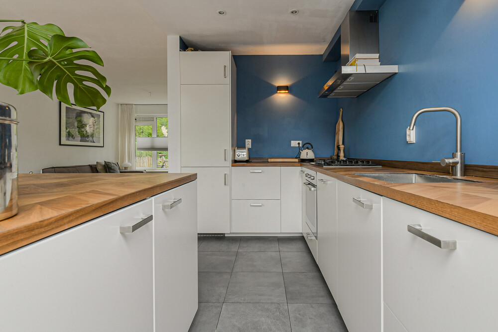 De moderne semi-open keuken (ca. 2.30 x 3.35 m) is gelegen aan de achterzijde en is voorzien van een aanrecht in hoekopstelling met een houtlook blad, rvs-spoelbak, 5-pits gaskookplaat (incl. wokbrander), elektrische oven, rvs-afzuigkap, koelkast, vriezer, vaatwasmachine en kastruimte. Voorts een extra afzetblad met houtlook blad en kastruimte. Vanuit de keuken via stapdeur toegang tot de tuin.