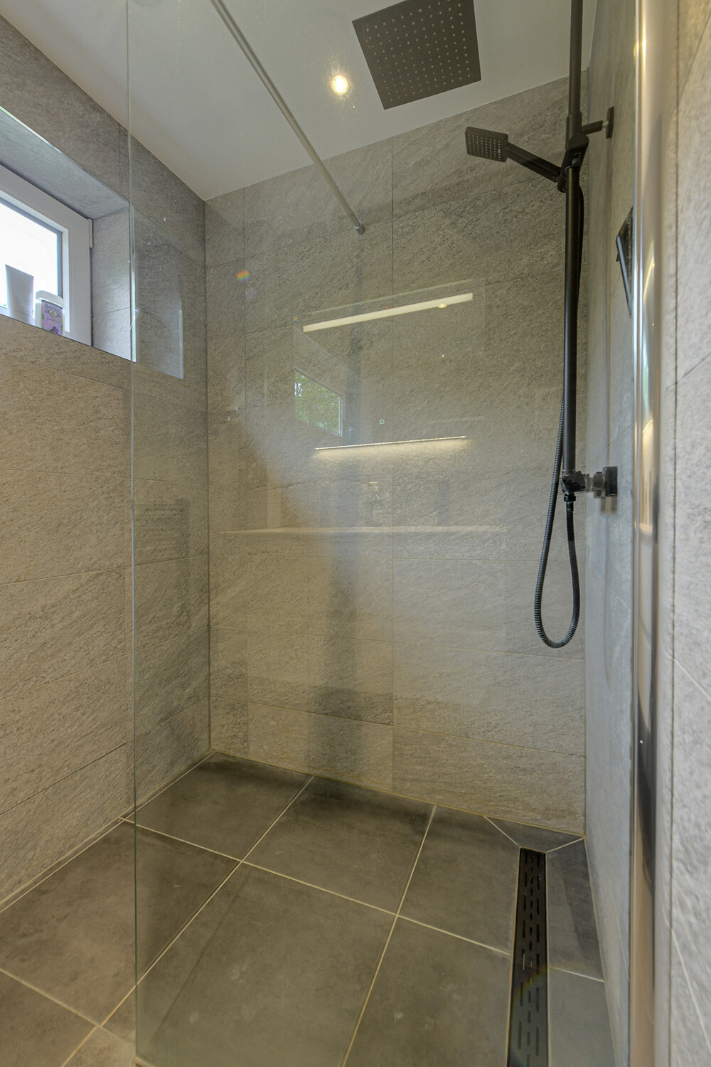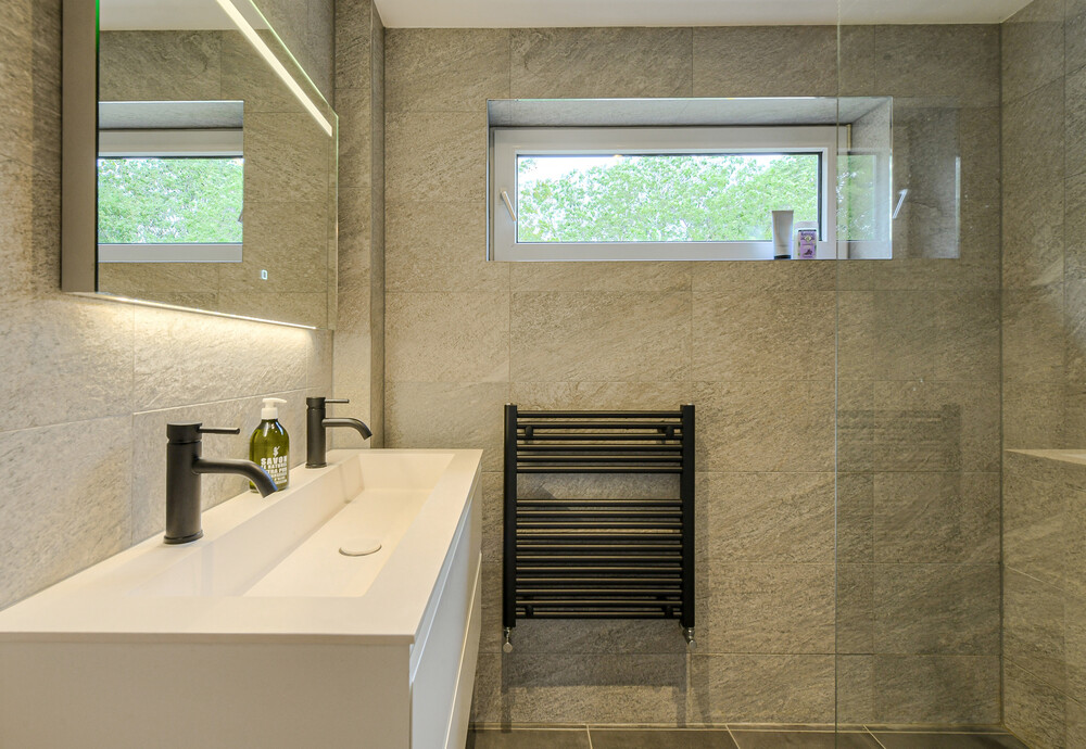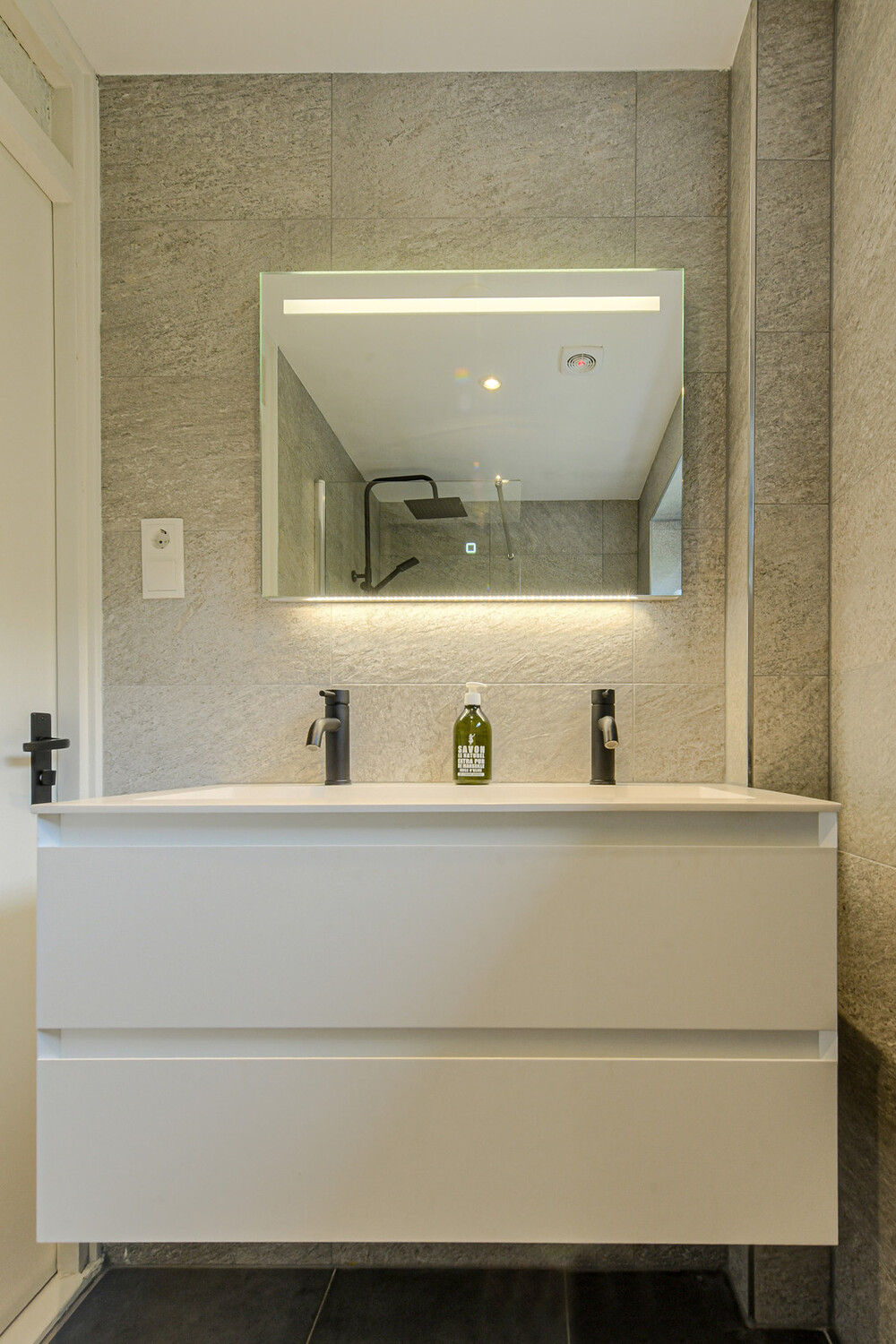 Moderne betegelde badkamer (ca. 1.40 x 2.15 m) gelegen aan de voorzijde en voorzien van een inloopdouche met regendouche, een wastafelmeubel met 2 kranen, kastruimte en een spiegel alsmede een handdoekradiator en mechanische ventilatie.
