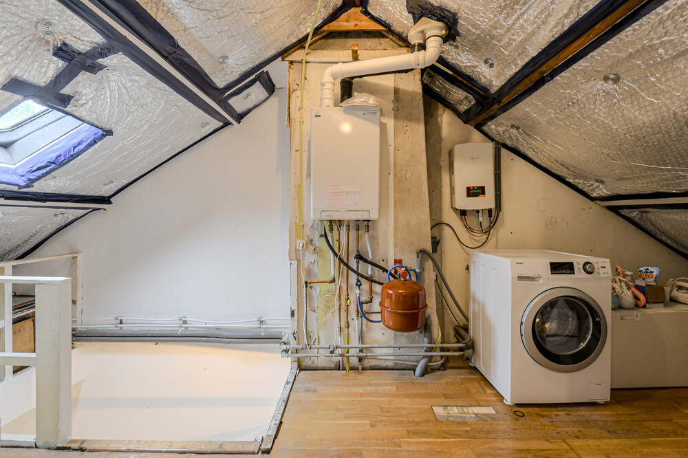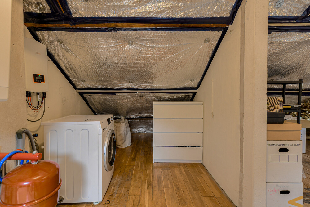 Via een vaste trap te bereiken voorzolder met dakraam,aansluiting wasapparatuur en opstelplaats voor de cv-ketel.