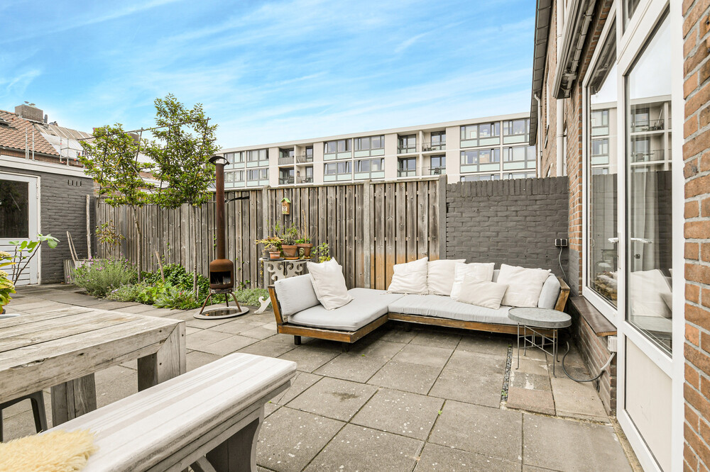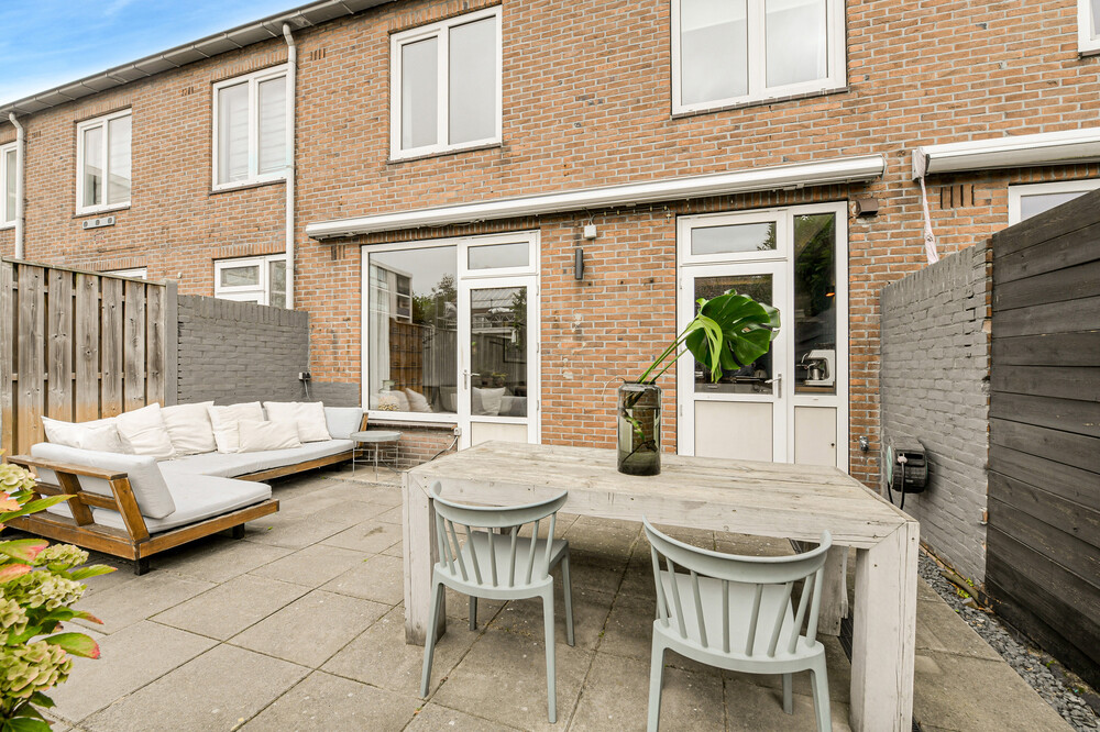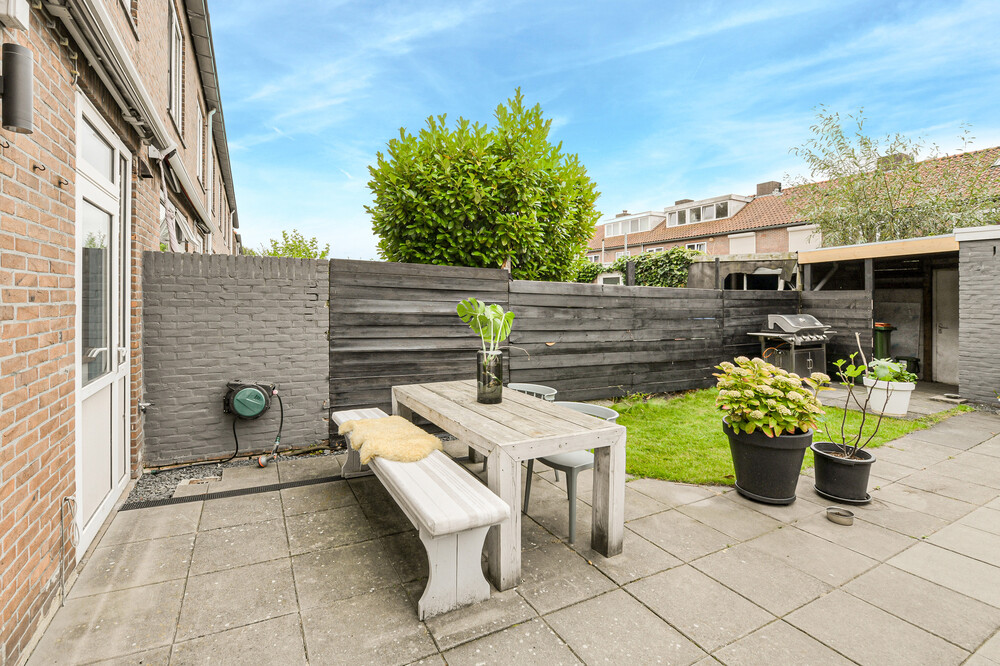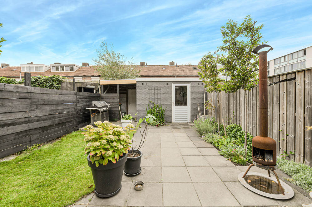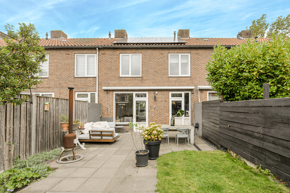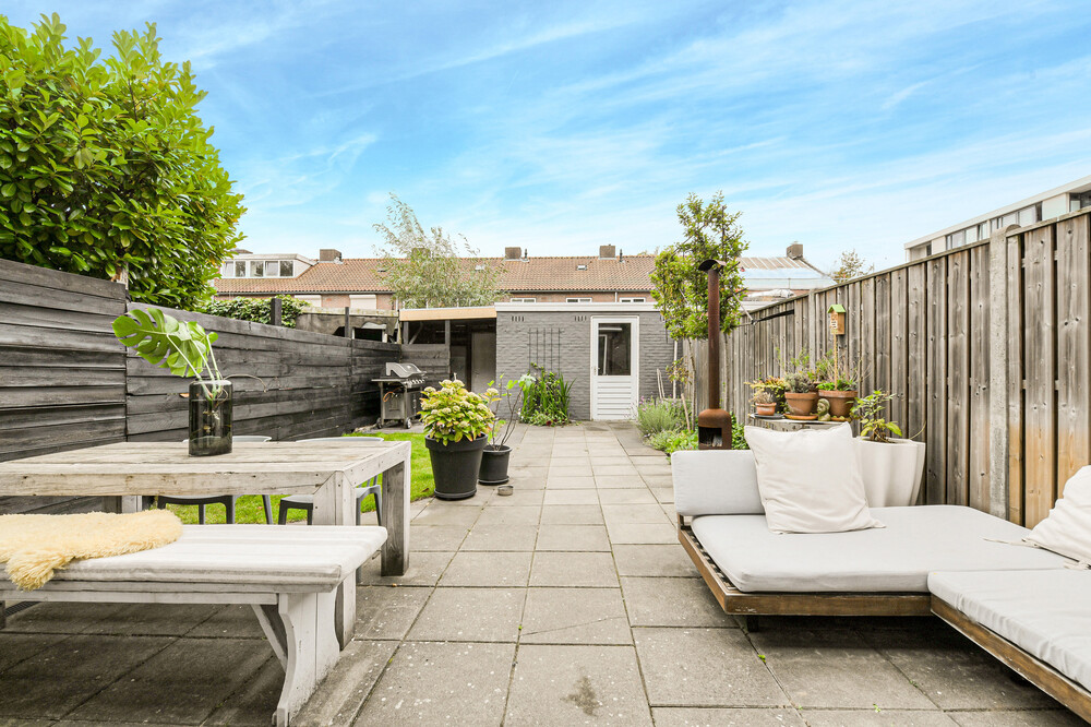 De achtertuin is ca 12.00 m diep en ca. 6.00 m breed en is gesitueerd op het zuidwesten. Deze tuin is aangelegd met betegelde terrassen, een gazon en borders. In de tuin bevindt zich een halfopen berging (ca. 2.00 x 2.25 m) met een achterom en een stenen fietsenberging (ca. 2.10 x 3 .60 m) voorzien van elektra. Het terras tegen de achtergevel is voorzien van een elektrisch bedienbaar zonnescherm.