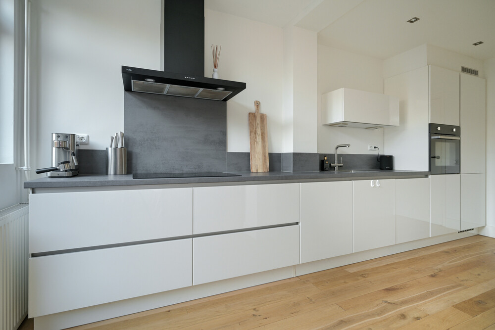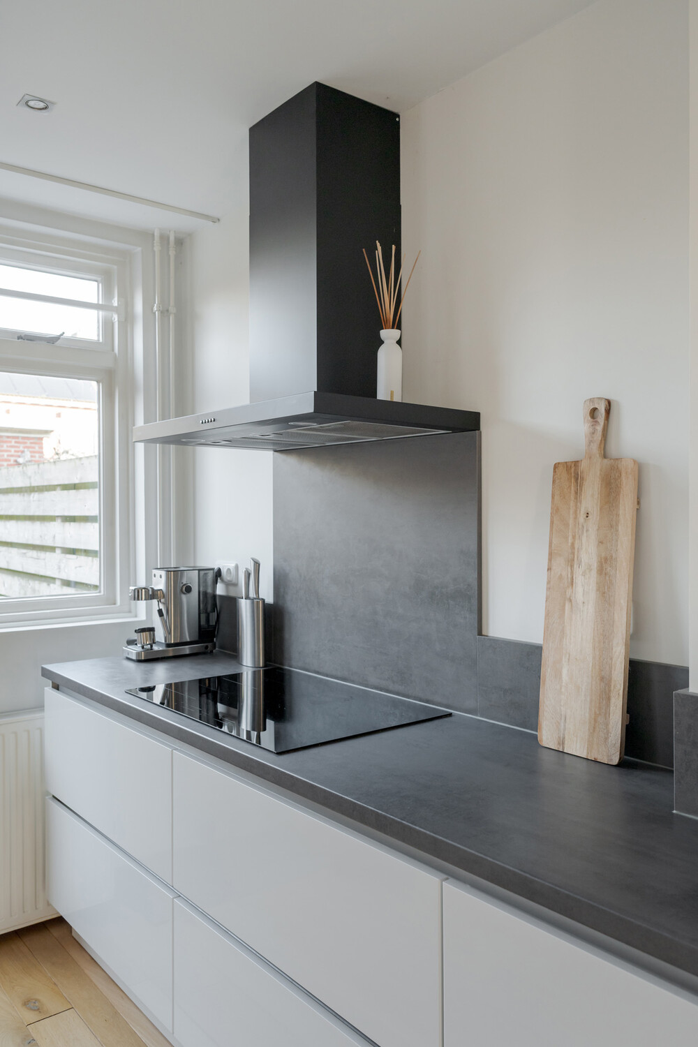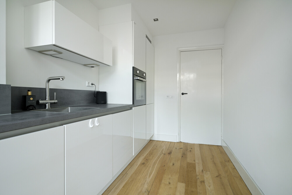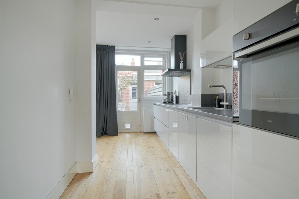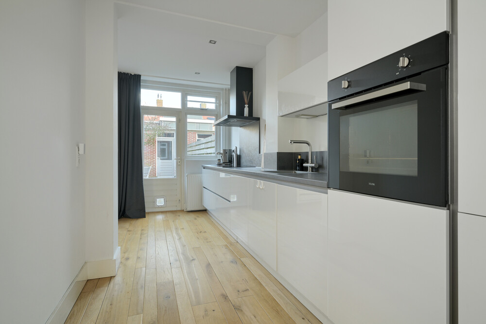 Keuken (ca. 5.10 x 2.10 m) voorzien van massief eiken vloer, moderne keukeninrichting bestaande uit een aanrecht met kunststof blad, rvs-spoelbak, inductie kookplaat, stalen afzuigkap, heteluchtoven, koelkast, vriezer, vaatwasser en diverse laden en kastruimte. Vanuit de keuken een stapdeur naar de achtertuin.