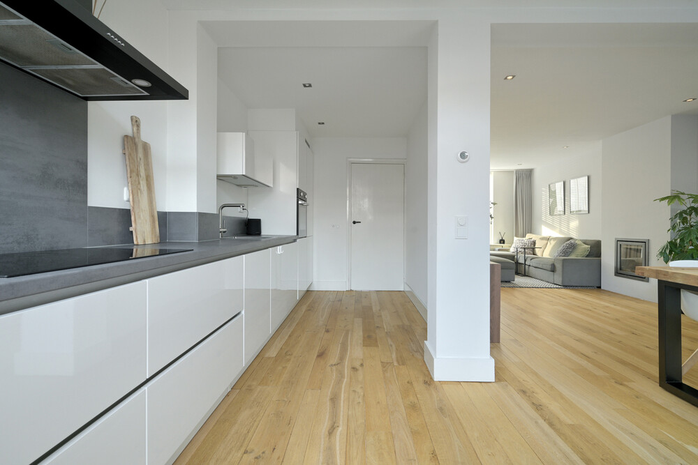 Schitterende, uitgebouwde woonkamer (ca. 8.25 x 3.50/5.70 m) met massief eiken vloer, open haard, inbouwspots en open verbinding naar de semi-open keuken.Keuken