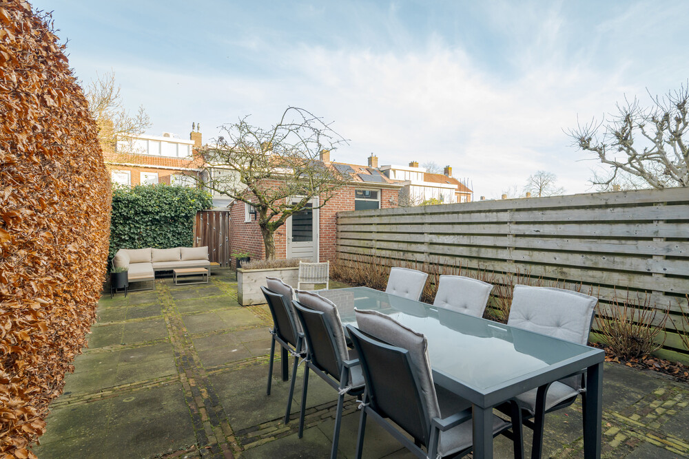 Ca. 11.50 m diepe achtertuin met eet- en loungeterras en borders met vaste beplanting. In deze tuin bevindt zich een stenen berging (ca. 2.00 x 2.90 m) met elektra en de tuin is bereikbaar via een achterom.