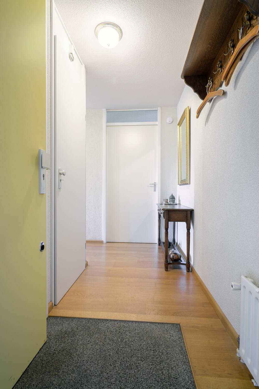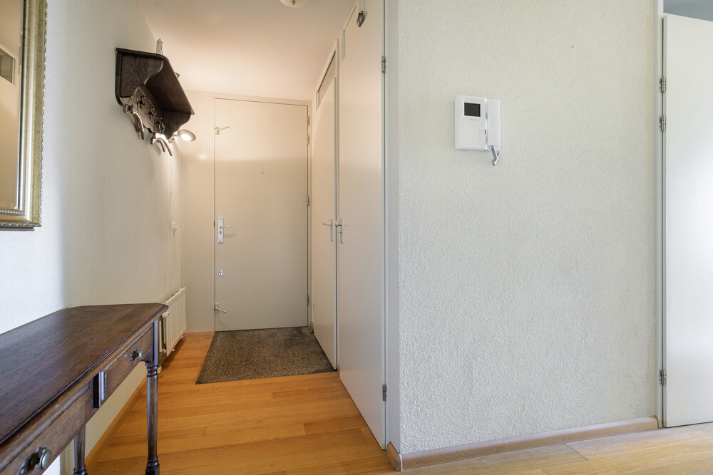 Entree in een L-vormige hal/gang met eikenhouten vloerafwerking, video-intercominstallatie en meterkast (7 groepen en aardlekbeveiliging).Toilet