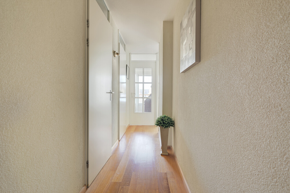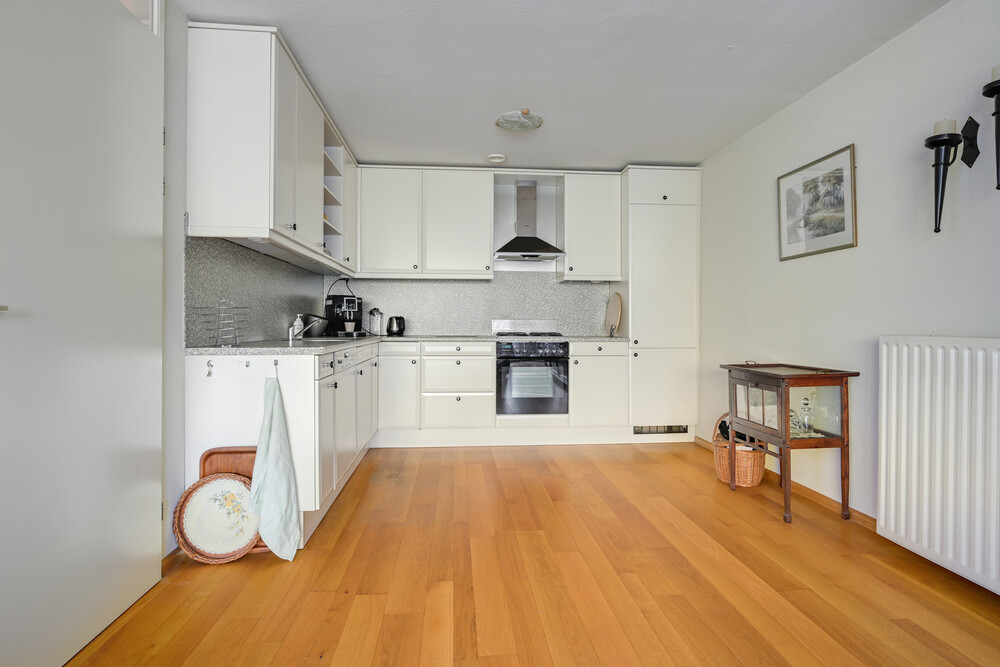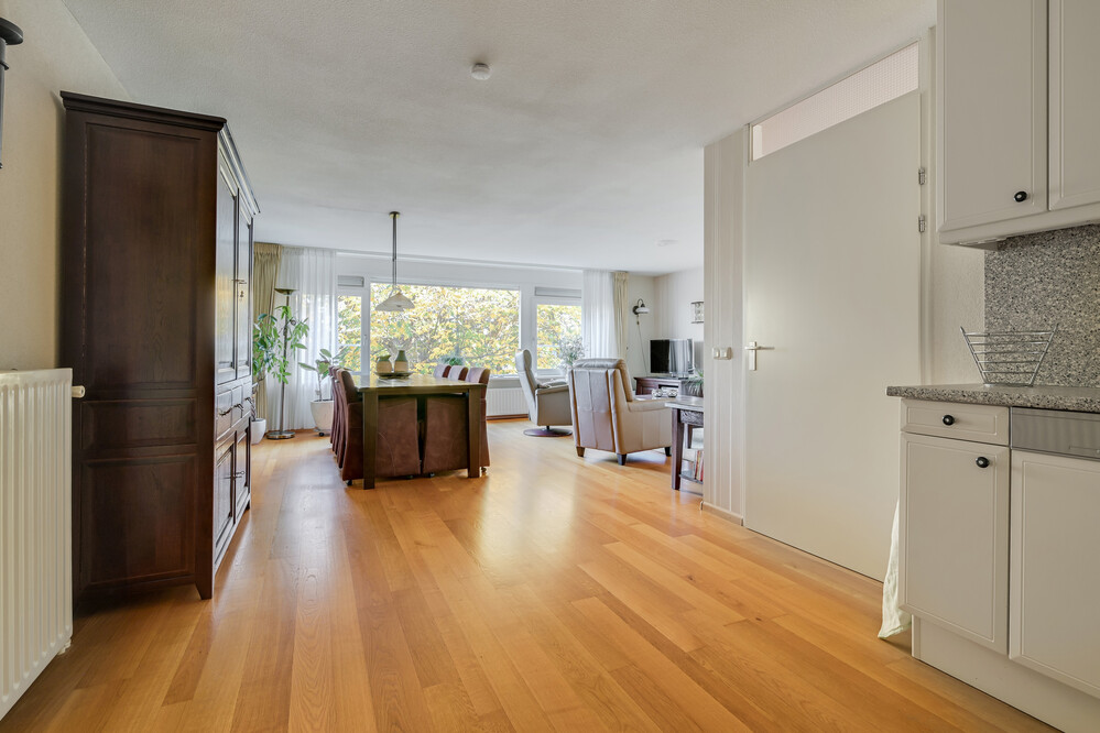 Fijne lichte en brede woonkamer (ca. 4,90 x 6,40 m) met eikenhouten vloerafwerking en uitzicht over de voor het appartement gelegen parkachtige tuin. De woonkamer en keuken hebben samen een oppervlakte van ca. 45m².Keuken
