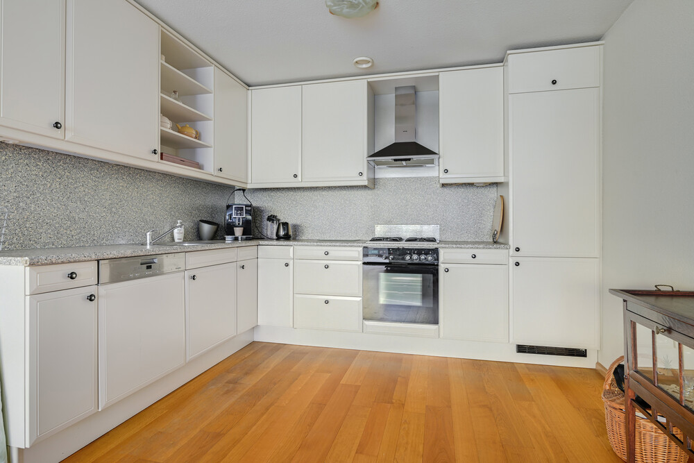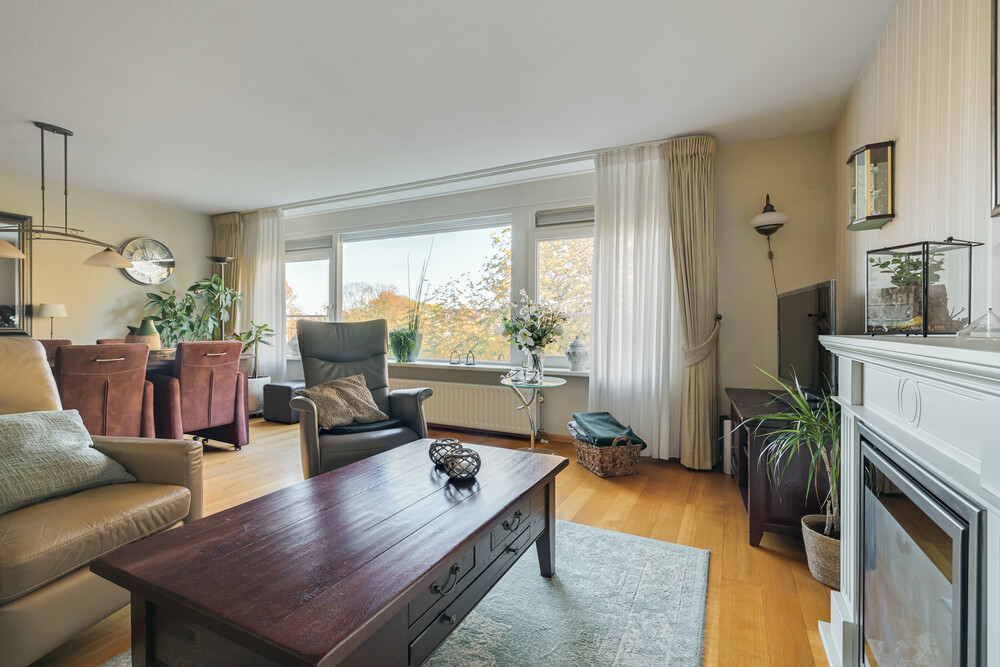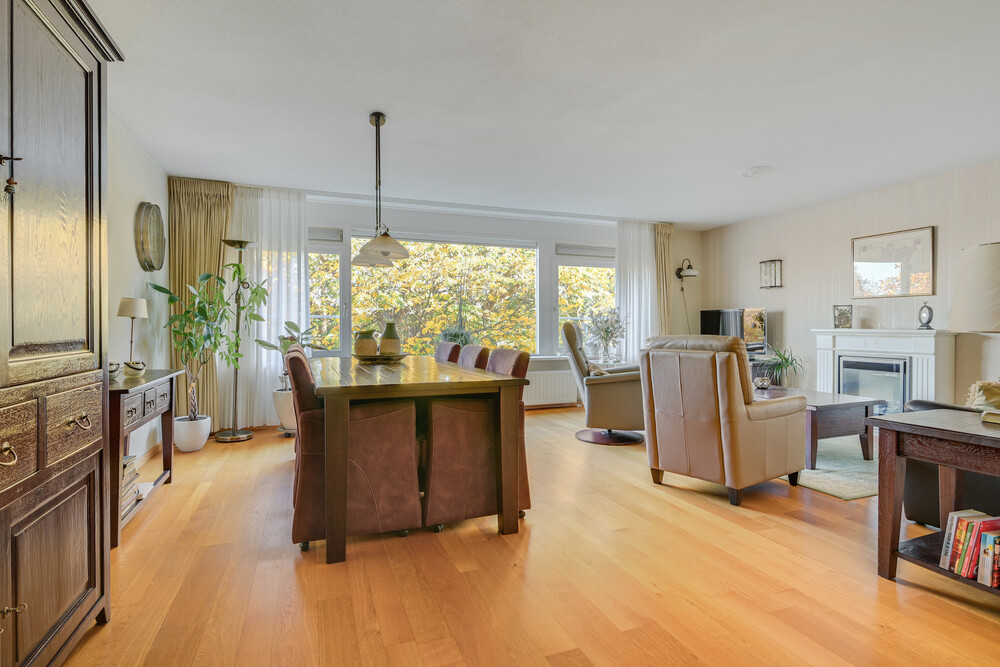 Fijne lichte en brede woonkamer (ca. 4,90 x 6,40 m) met eikenhouten vloerafwerking en uitzicht over de voor het appartement gelegen parkachtige tuin. De woonkamer en keuken hebben samen een oppervlakte van ca. 45m².Keuken