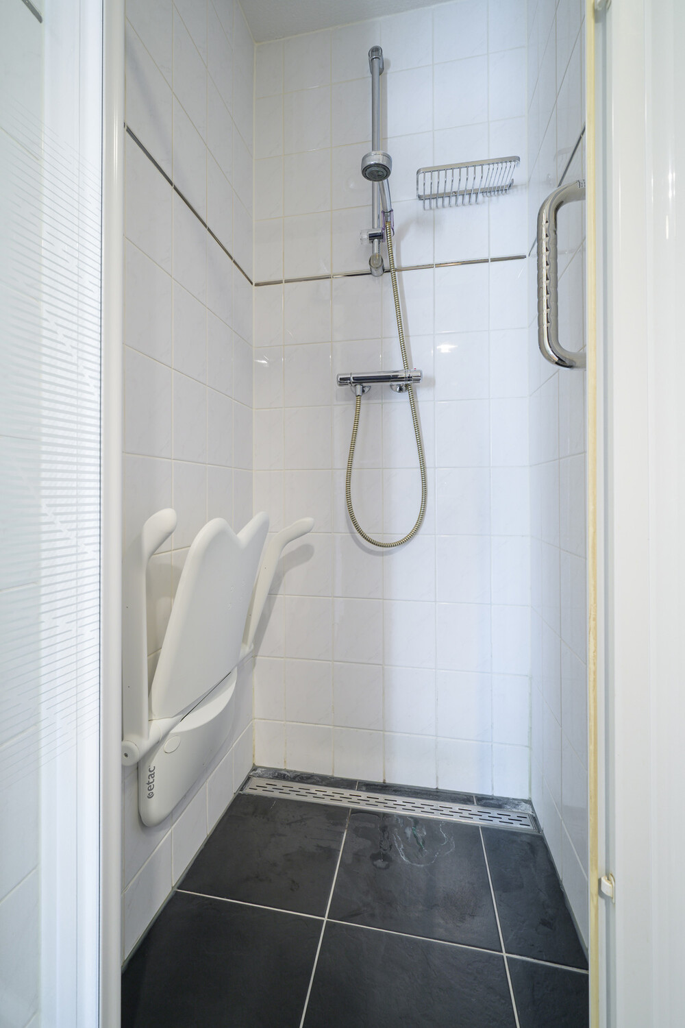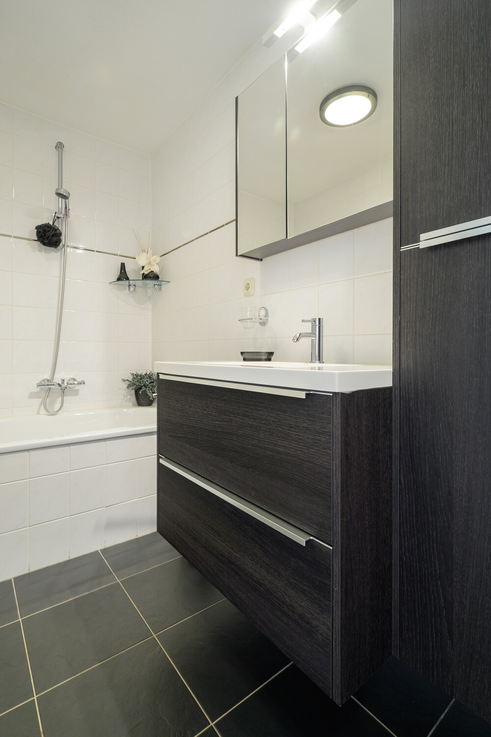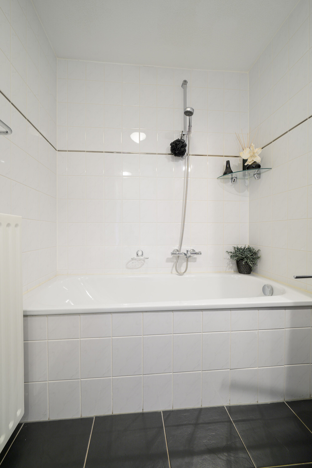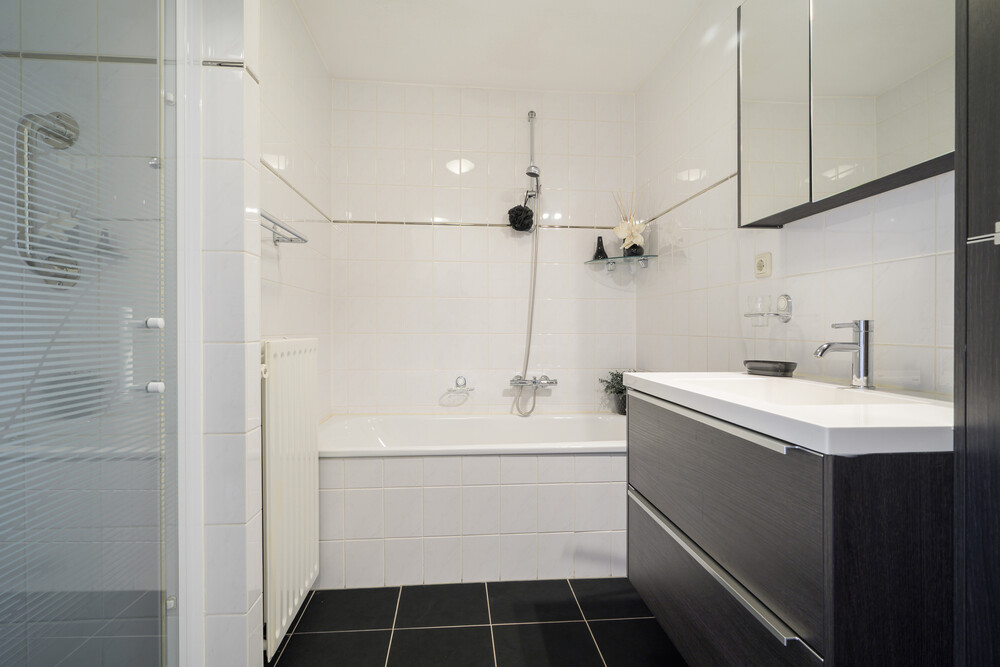 Badkamer (ca. 1,65 x 2,40 m en ca. 1,00 x 0,85 m) voorzien van ligbad met thermostaatkraan, separate douche met thermostaatkraan en een badkamermeubel met wastafel, spiegel en ruim voldoende kastruimte.Berging/bijkeuken