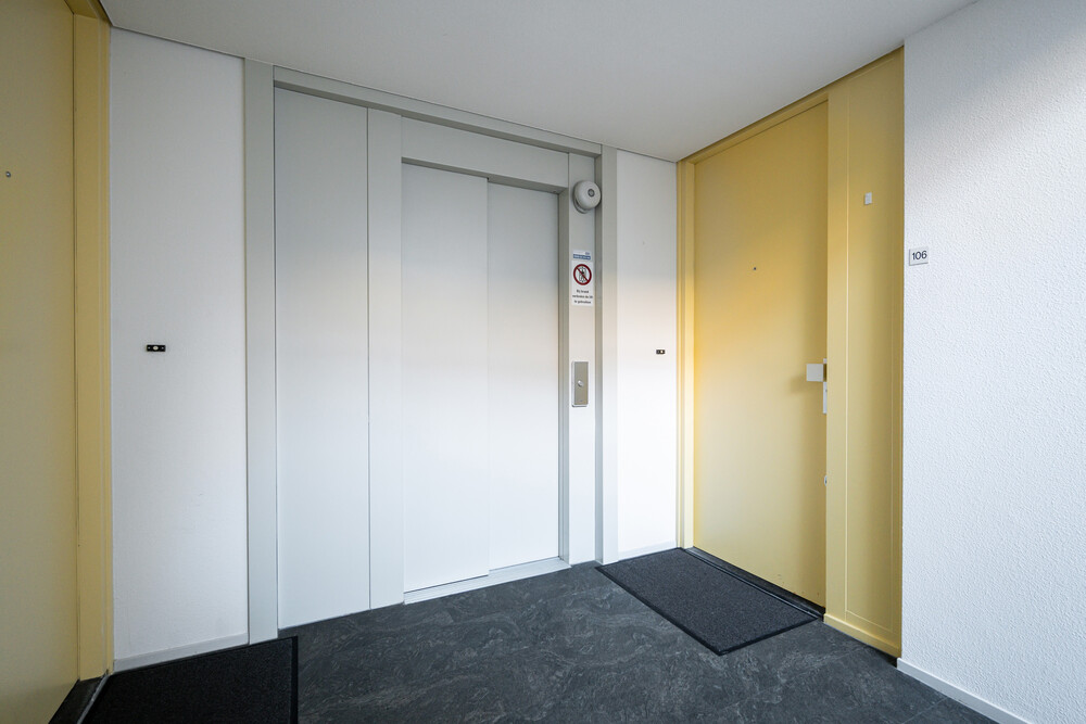 Algemene entree met bellentableau, brievenbussen en video intercominstallatie. Centrale hal waar zich de toegang tot de lift, het trappenhuis en de bergingen bevinden.Berging