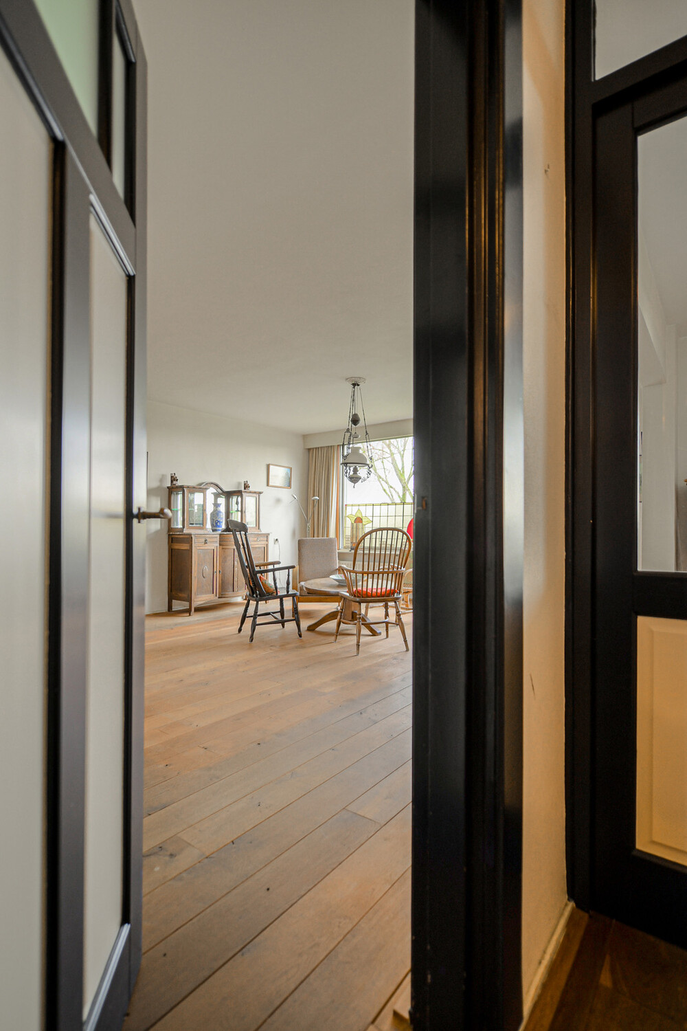 Royale L-vormige woonkamer van ca. 44 m² met houten vloer, grote raampartijen en directe toegang tot het balkon.Balkon