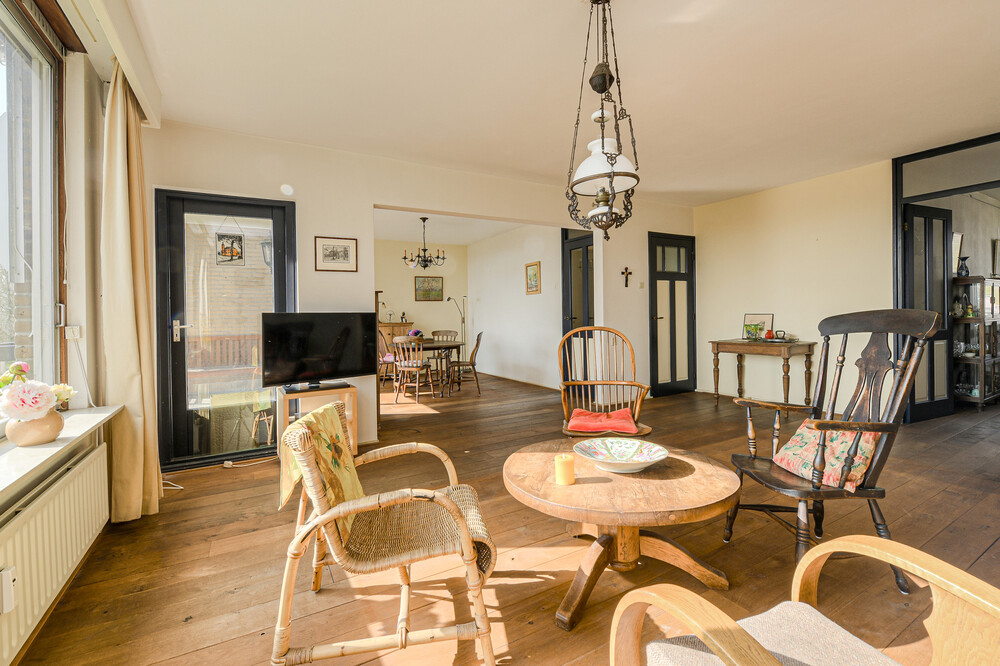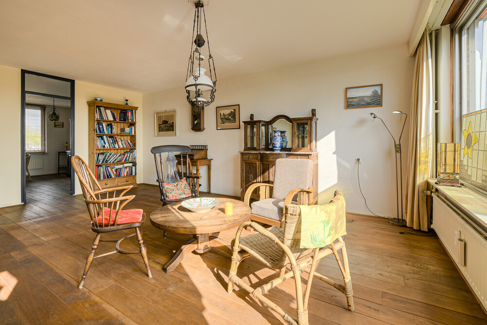 Royale L-vormige woonkamer van ca. 44 m² met houten vloer, grote raampartijen en directe toegang tot het balkon.Balkon