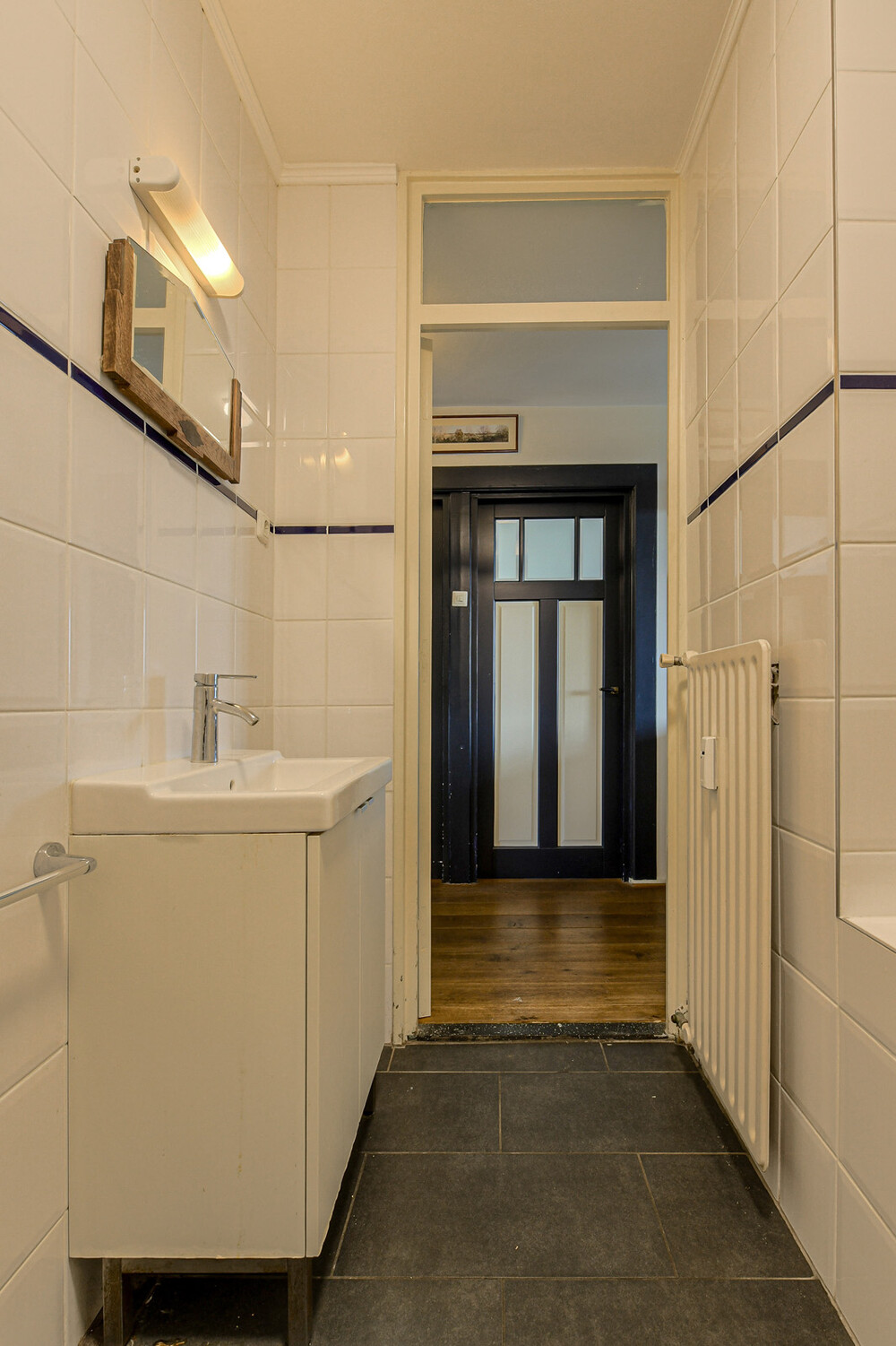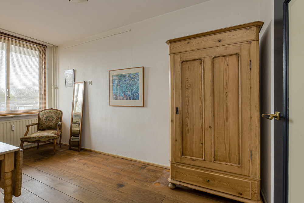 Tweede slaapkamer bereikbaar vanuit de hal en eveneens voorzien van een houten vloer.Badkamer
