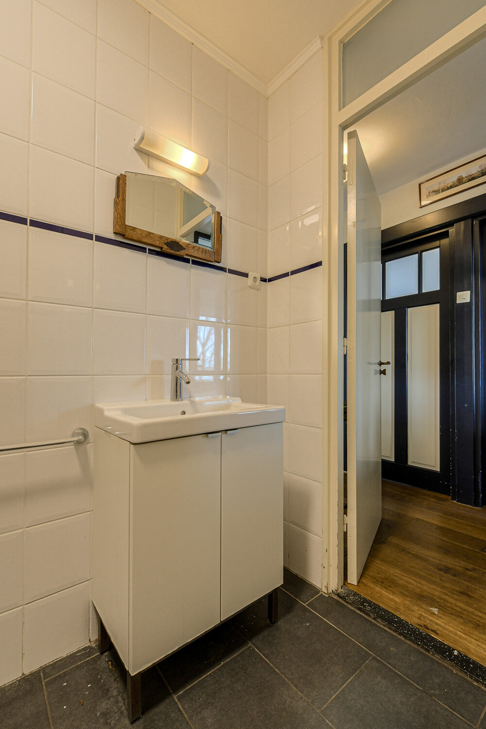 Gedeeltelijk betegeld toilet met fonteintje.Woonkamer