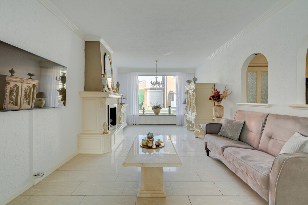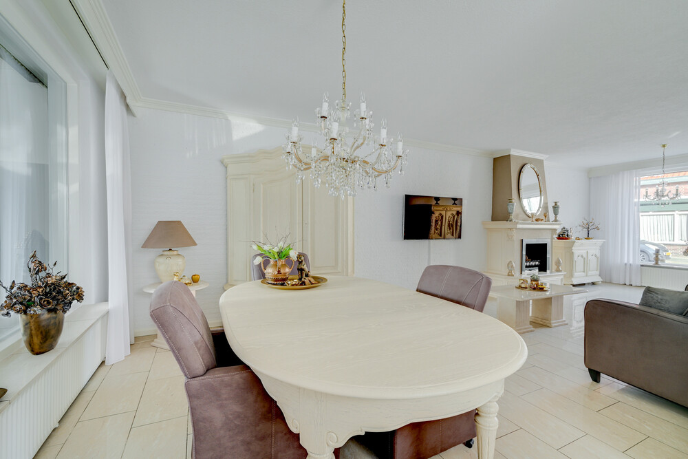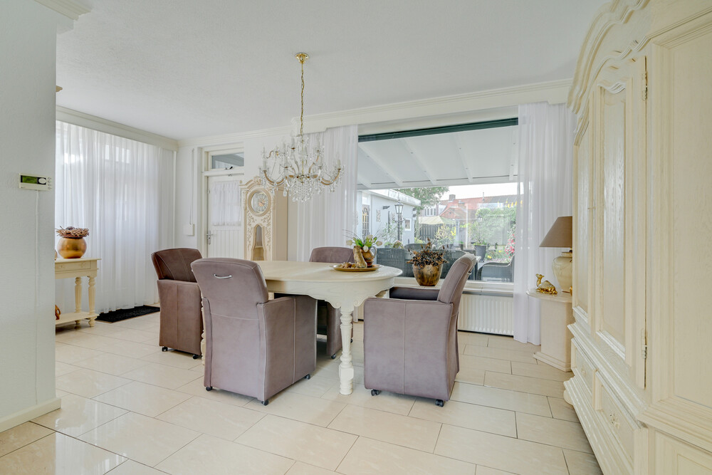 De woonkamer kenmerkt zich door de prettige lichtinval en de ruime opzet, mede dankzij de uitbouw. De open haard zorgt voor extra sfeer en warmte. De halfopen verbinding met de keuken geeft een open en ruimtelijk gevoel.De gehele begane grond is afgewerkt met een dubbele hardgebakken tegelvloer.