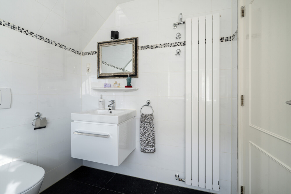 De badkamer is compleet uitgevoerd met een douchebak, zwevend wandcloset, wastafelmeubel en een designradiator.