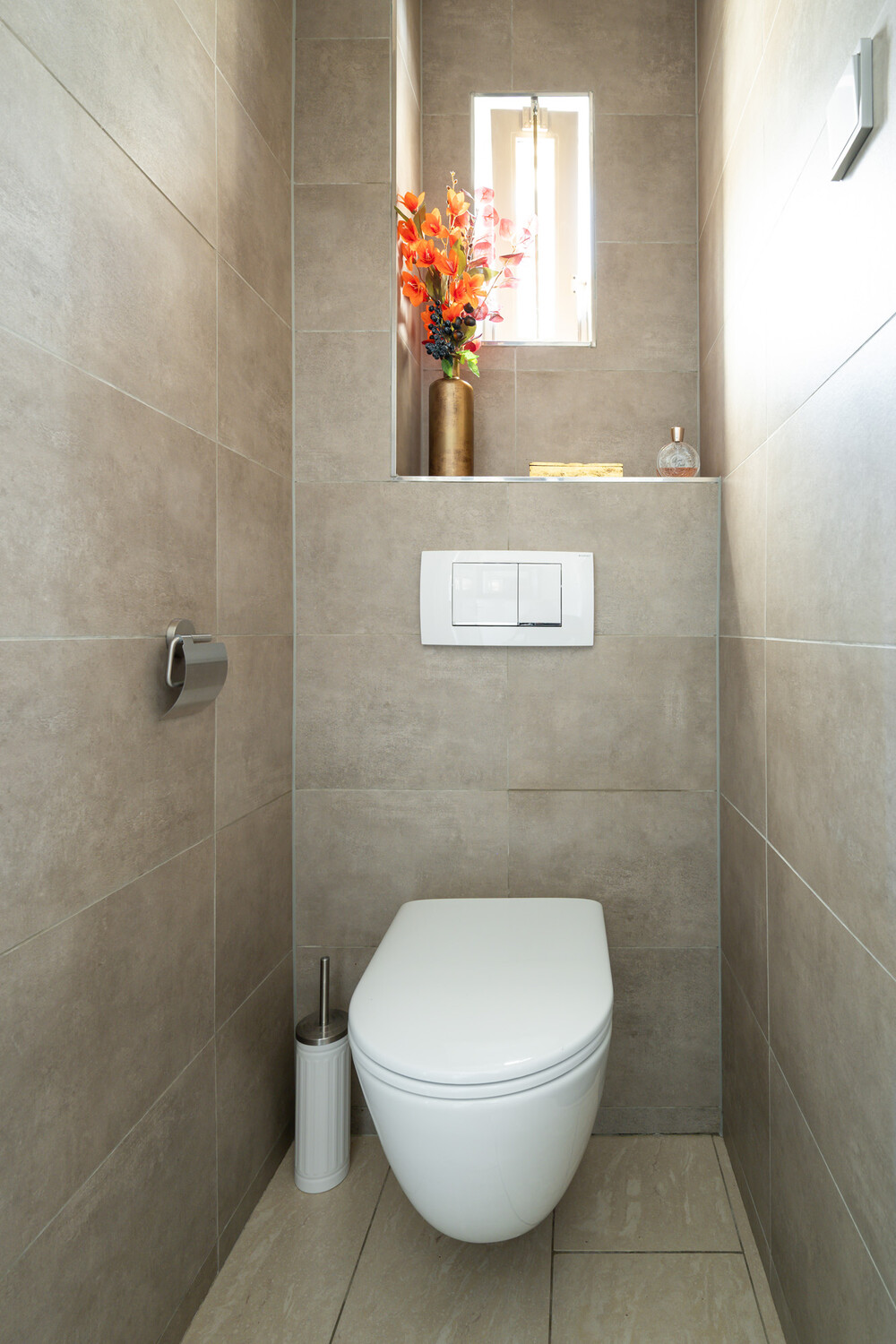 Modern uitgevoerd toilet met zwevend closet en inbouwreservoir.Woonkamer / keuken