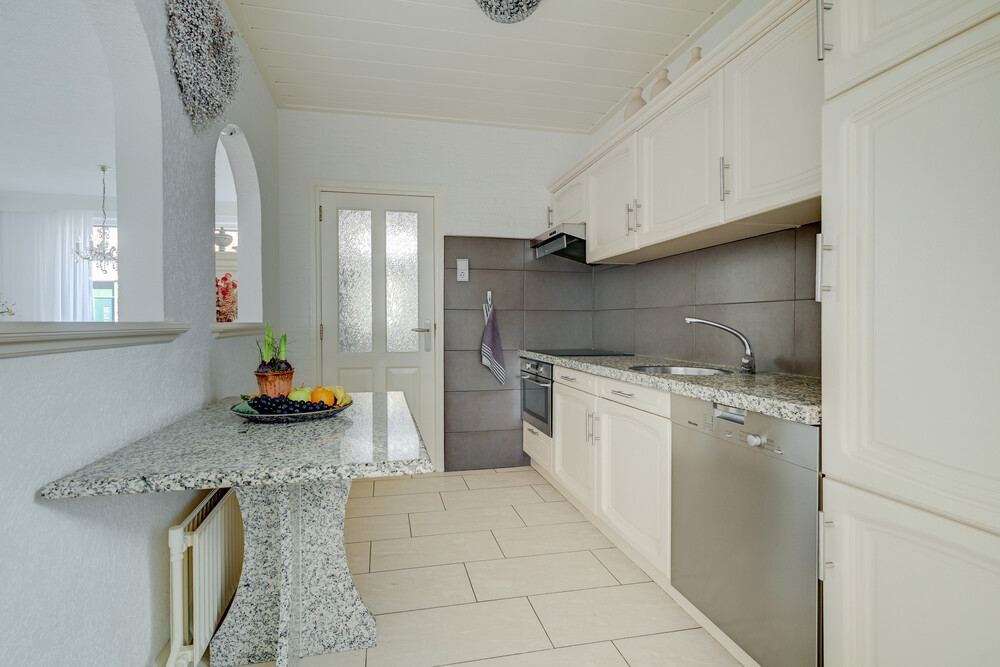 De halfopen keuken is praktisch ingericht en voorzien van een 4-pits inductiekookplaat, afzuigkap, vaatwasser, koelkast en vriezer. Daarnaast beschikt de keuken over diverse boven- en onderkasten voor voldoende bergruimte.