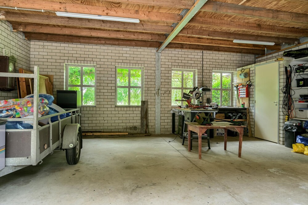 Het bijgebouw bestaat uit 2 delen. De rechterzijde is een multifunctionele berging/hobbyruimte waarboven een volwaardige zolderetage. De linkerzijde, nu in gebruik als hobbyruimte, biedt ruim plaats aan 2 auto’s.Dit bijgebouw is voorzien van krachtstroom.