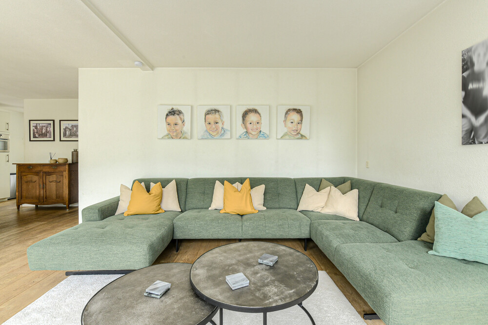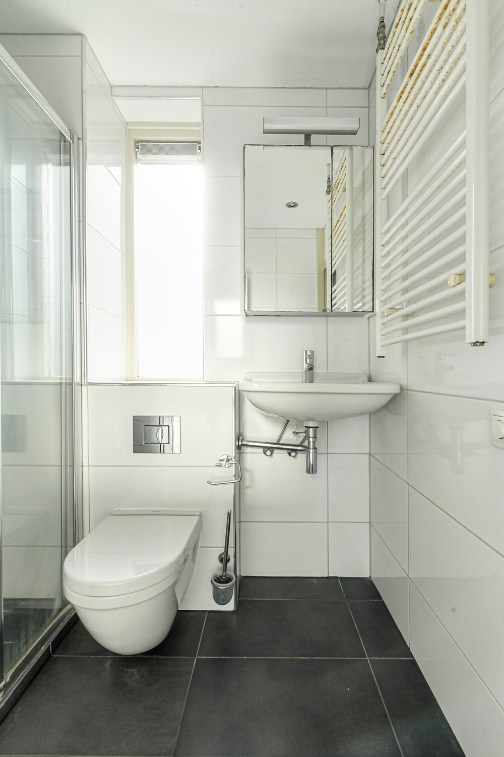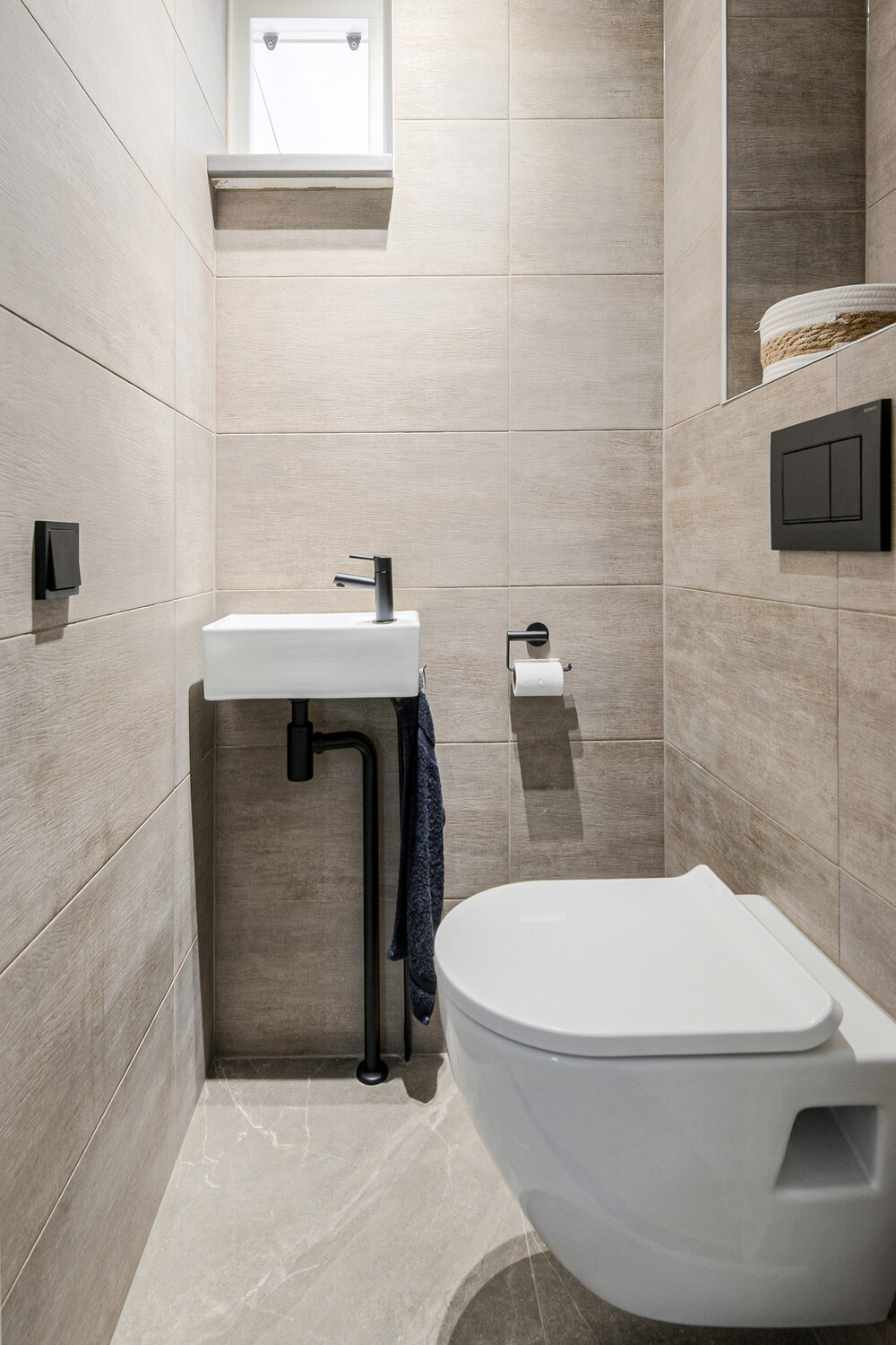Het toilet is geheel betegeld en voorzien van een wandcloset met inbouwreservoir en een handwasbakje.Woonkamer