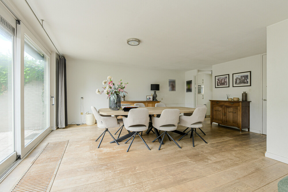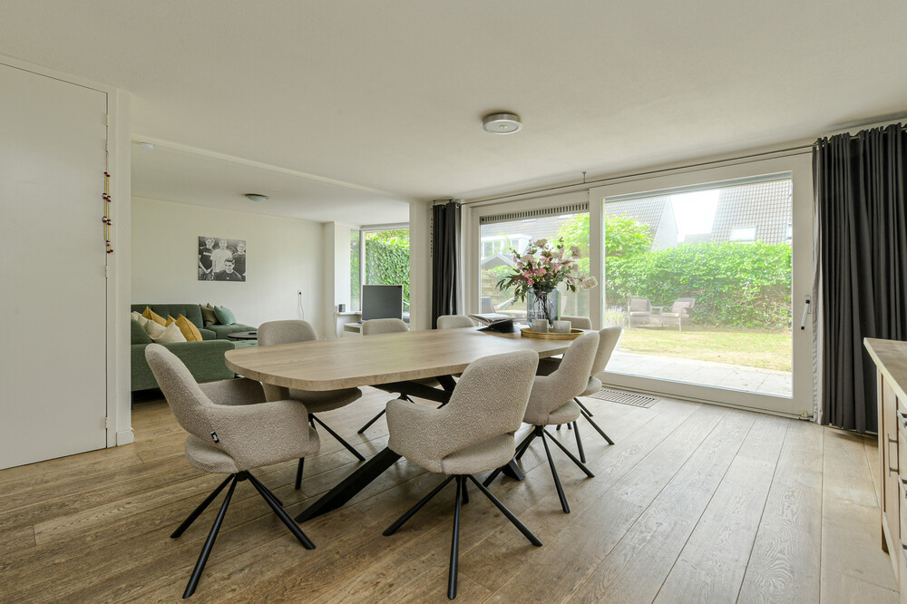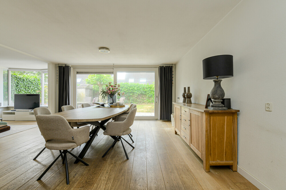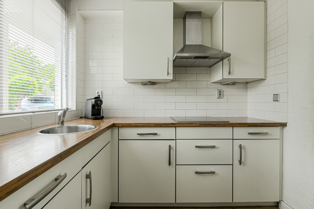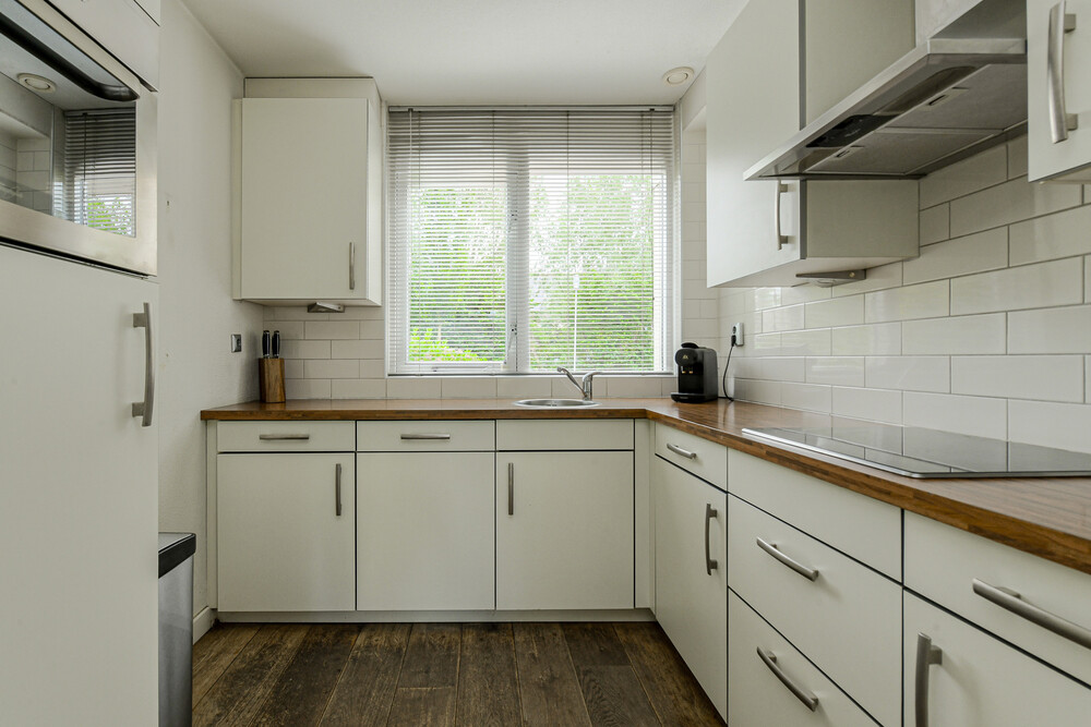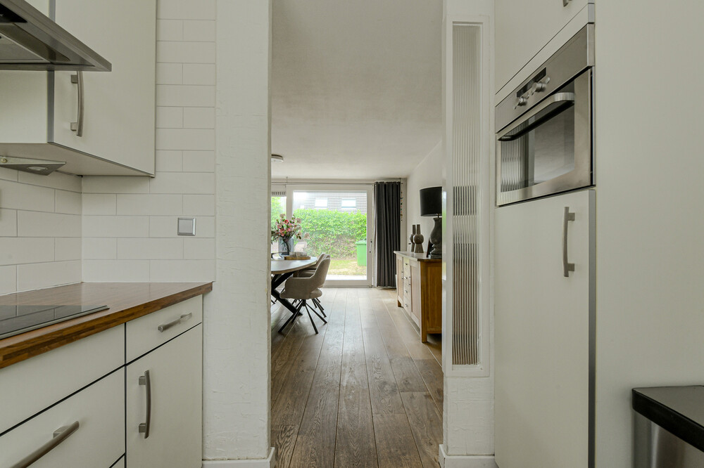 De ruime en lichte L-vormige woonkamer is tuingericht en afgewerkt met een houten vloer en beschikt over een bloemenvenster, een provisiekast en een schuifpui naar de achtertuin. Vanuit de woonkamer is er een halfopen verbinding naar de keuken.Keuken