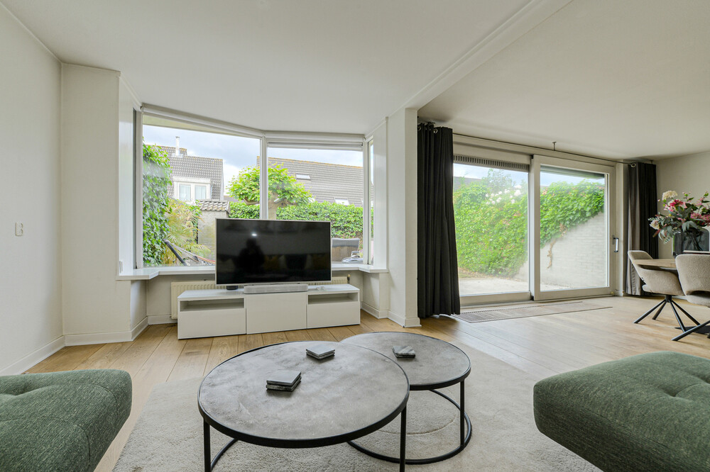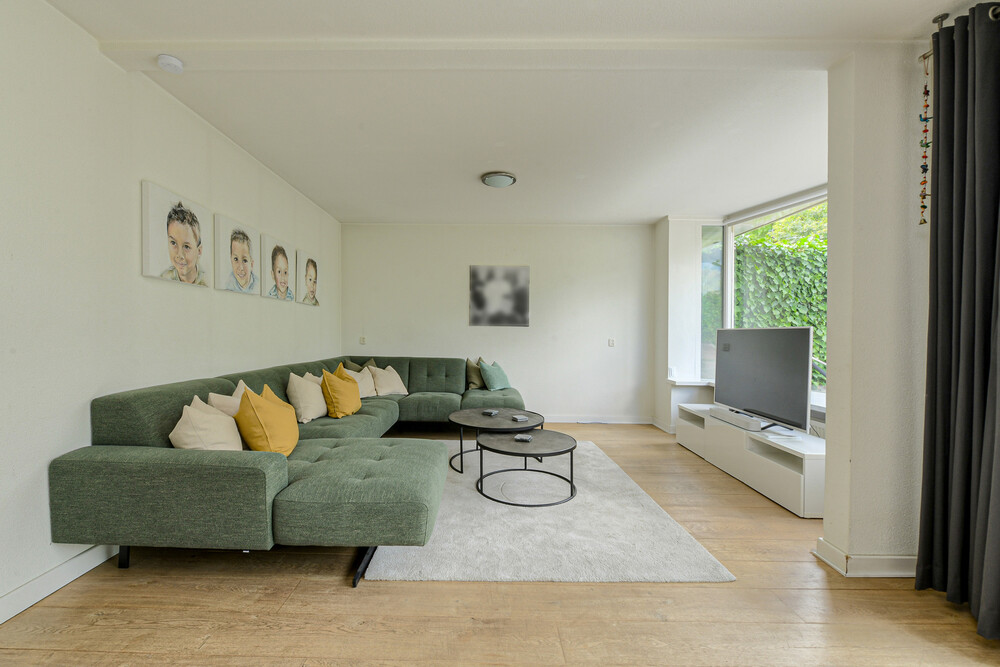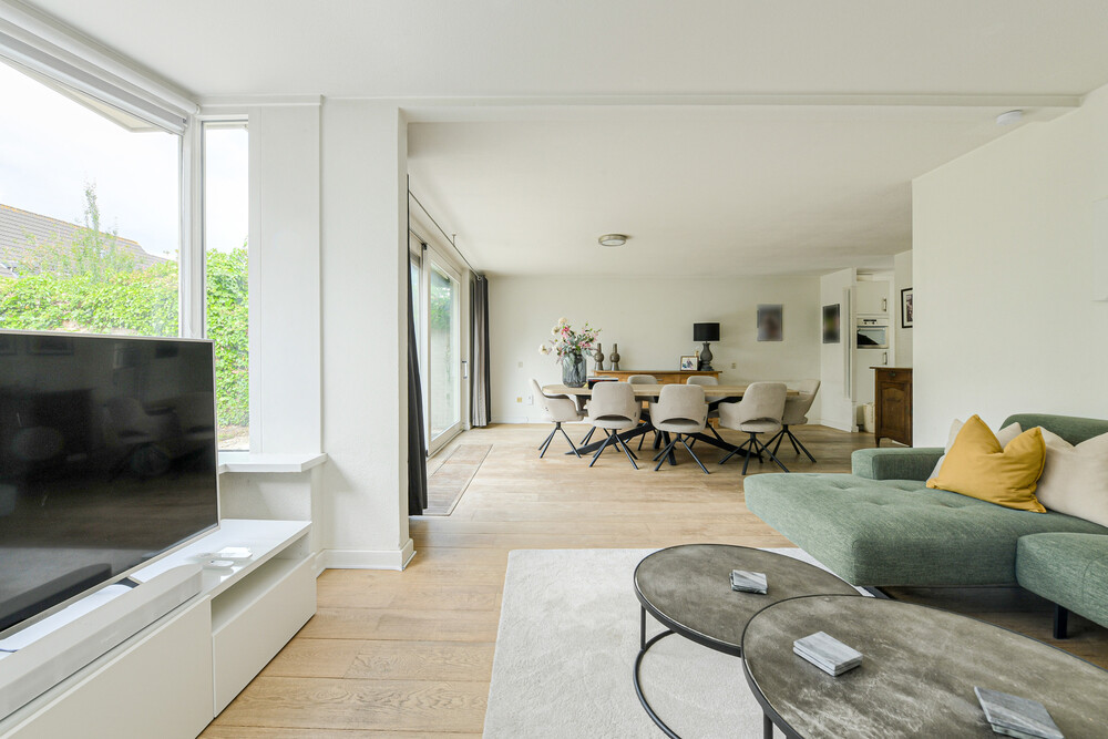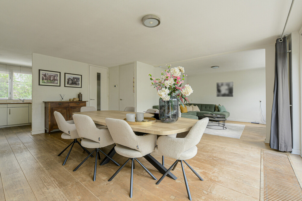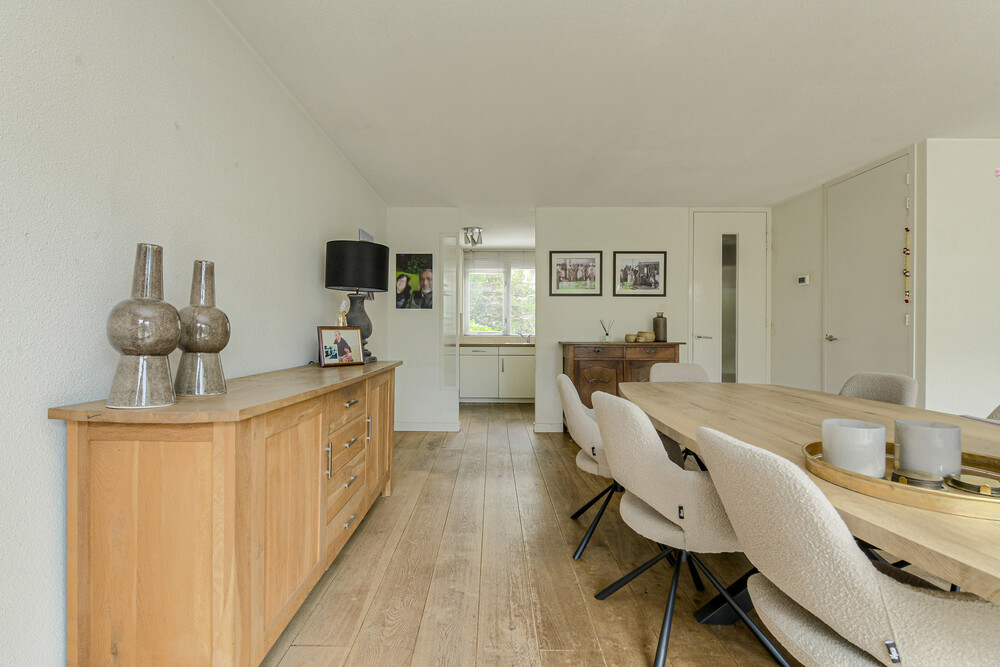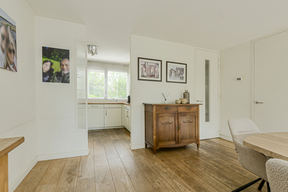 De ruime en lichte L-vormige woonkamer is tuingericht en afgewerkt met een houten vloer en beschikt over een bloemenvenster, een provisiekast en een schuifpui naar de achtertuin. Vanuit de woonkamer is er een halfopen verbinding naar de keuken.Keuken