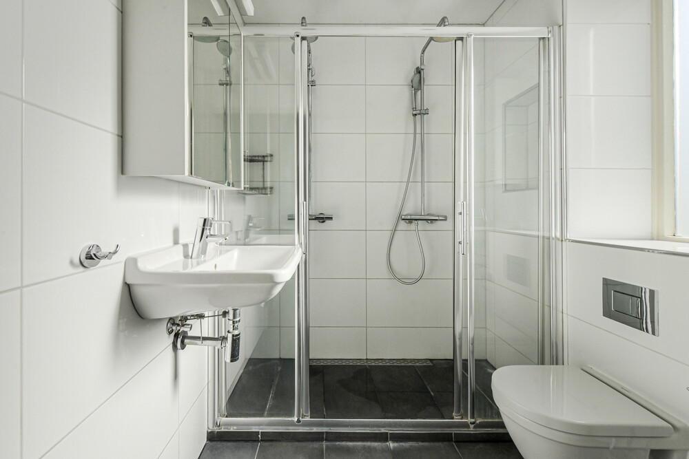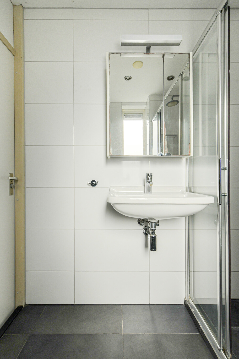 Betegelde badkamer gelegen aan de voorzijde en voorzien van een inloopdouche met dubbele regendouche, een wastafel en een wandcloset met inbouwreservoir.